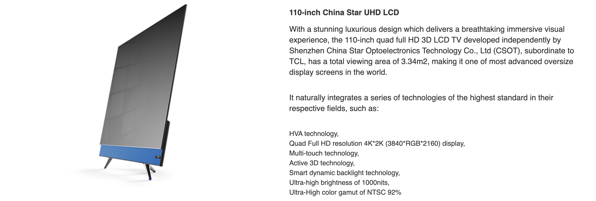 The successful development of China Star 110 UHD signifies that TCL has taken a historic step forward in the development and innovation around flat panel displays.