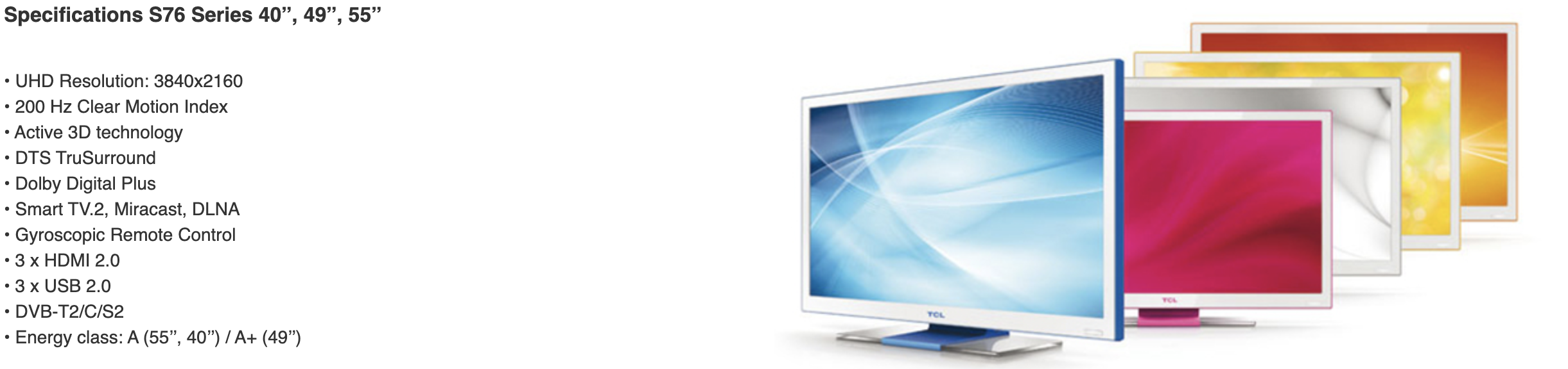 TCL presents its Color Touch range at this year’s IFA with new colors, for every taste and every home as well as the S76 series – TCL’s UHD range in a very elegant design, for excellent image quality.