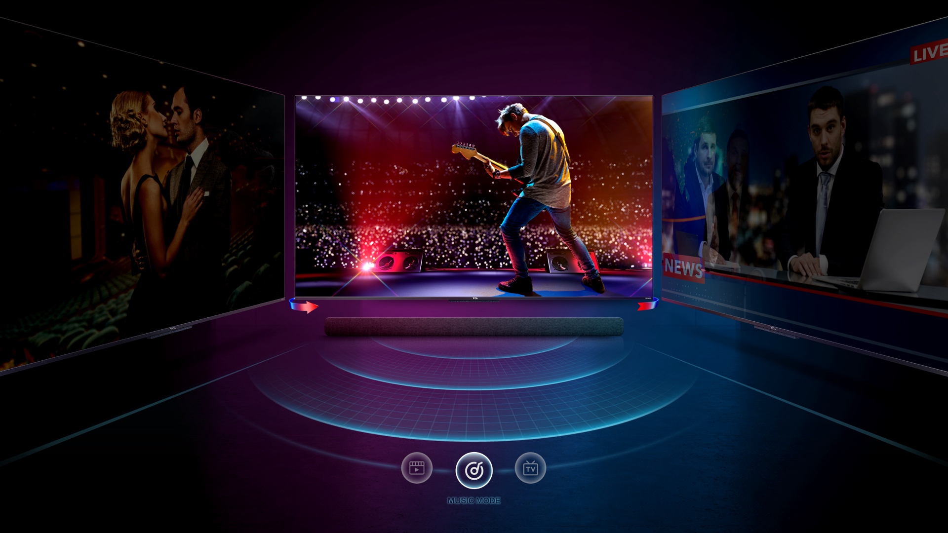 To get the most of your soundbar and have the best experience, we've included special sound modes. This way you always get the best possible sound experience no matter if you are just watching TV, want to be immersed in a great movie or enjoy your favourite music on your soundbar.
