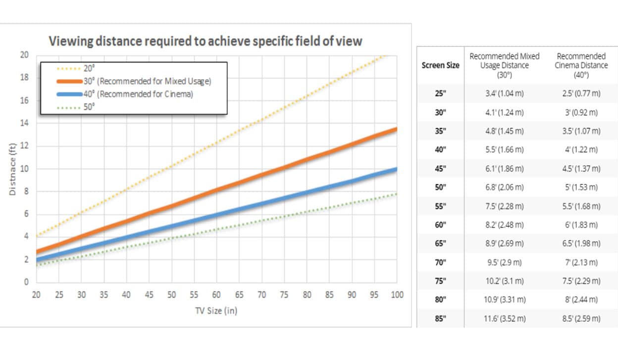 This is generally sound advice, but those who watch movies mostly on TV might benefit from moving closer in order to have a more cinematic experience. The THX suggestion and the SMPTE "reference" position for movie theaters are both around 40°. However, the minimum angle of vision works well for most applications, and most people should feel comfortable sitting at a distance where the screen occupies 30 degrees of their horizontal field of vision.