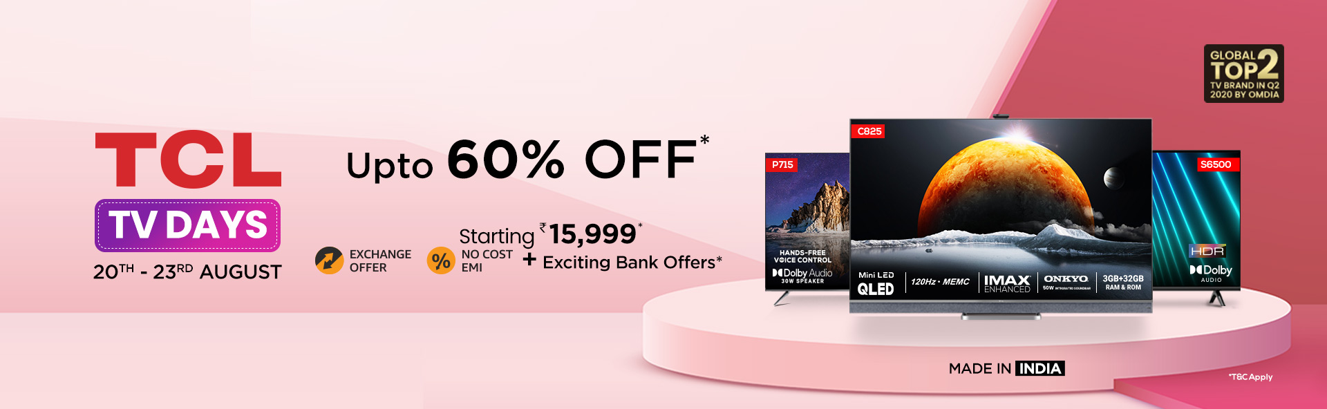 TCL a leading global consumer electronics brand has announced the dates for the much-awaited TCL TV Days. The sale would be live on the leading e-commerce platform Amazon from August 20, 2021, to August 23, 2021. TCL will provide up to 60% off on its range of premium smart TVs including some of the latest launches. During the sale premium models from TCL like the newly launched Mini LED C825, P715, and other 4K TVs would be available at the best price. During the TCL TV Days, the customers can also avail exciting bank offers for added benefits.