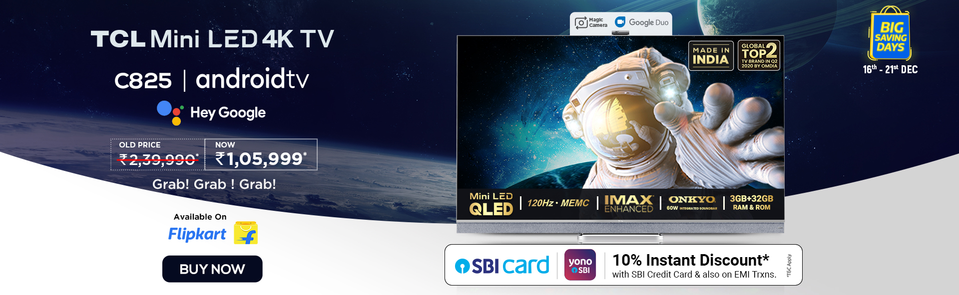New Delhi, December 15, 2021: The holiday season is all about enjoying some quality time with the family watching your favourite movies and series on a TV with the best audiovisuals that will convert a regular TV viewing experience to a cinematic one. TCL the second largest TV manufacturer globally has a lot to offer to its customers in this regards. Pioneer of the latest TV technology known as the Mini LED, TCL TVs take your TV viewing experience to the next level. The brand also has many other premium and regular offerings to choose from. The good news for the consumers is that they can now save heavily upon their purchase of TCL TVs during the Flipkart Big Saving Days Sale from December 16, 2021 to December 20, 2021. The customers can also avail exciting bank offers and deals to maximize their savings.
