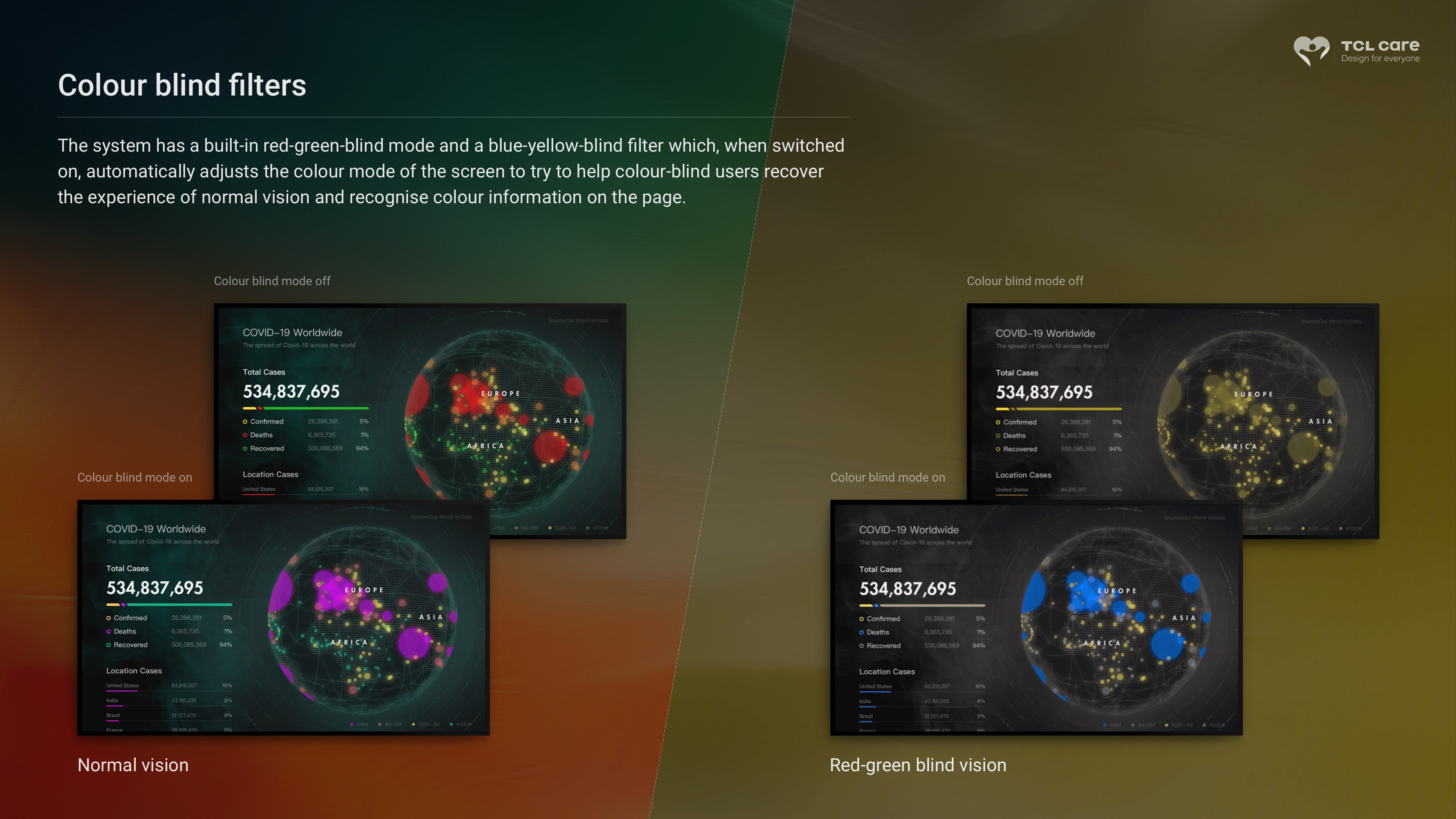 The International Paralympic Committee and the International Disability Alliance estimates that 15% of the world's population suffer from some form of disability. The epidemic has led to more people staying home. Going out, especially for the elderly, children and impaired people has become a luxury. As a truly user-centered company, we are committed to making everyone's experience easy. Watching TV is not just the right of normal people. As the industry's first TV care solution, “TCL care” covers everyone including the disadvantaged to offer a more friendly TV experience. We democratize TV experience for all people so that everyone can conveniently experience the rich and colorful life even within their homes.