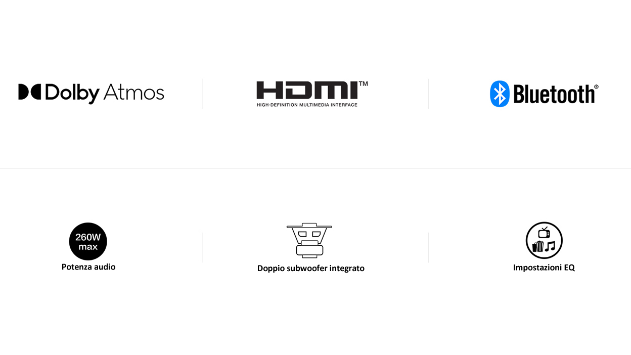 Questa soundbar combina 2.1 canali, doppio subwoofer integrato e la tecnologia Dolby Atmos per creare un'esperienza senza eguali anche in piccoli spazi.