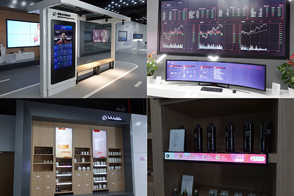 そのほか、ディスプレイ技術を応用した産業用途の展示も多数あります。バス停向けは高い輝度と耐久性が重要。各種監視用途には大型マルチディスプレイ技術や超横長ディスプレイ、販売店舗のPOP用は各種サイズや形状のほか、扱いやすい表示システムの提供も重要になります。