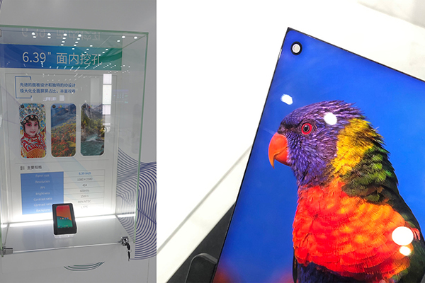 最新パネル技術は、カメラレンズ部分のみを穴状に切り抜いた「面内掘孔」タイプ。TCLが日本で発売を開始した最新スマホ「PLEX」にも同等品が搭載されている模様。展示品のスペックはIPS/6.39インチ/1080×2340画素/1500:1/600nits。