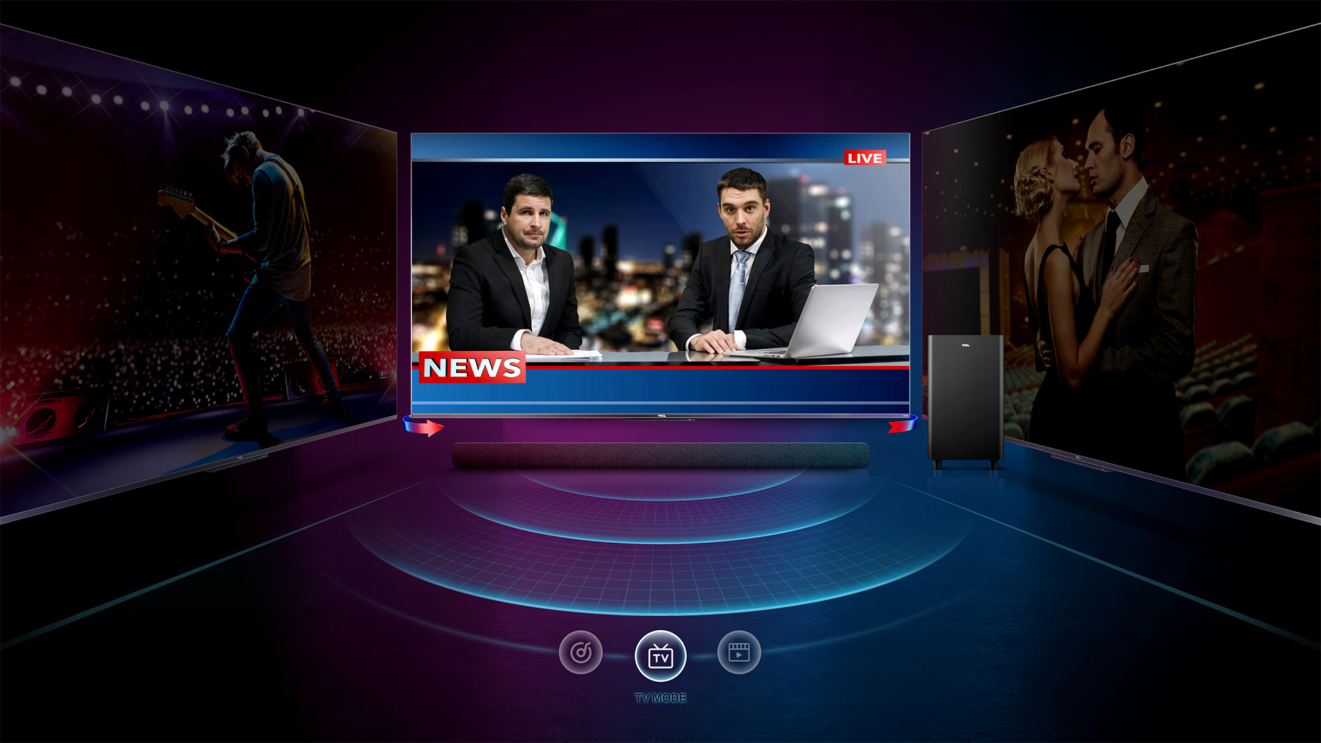 MOVIE(映画)/MUSIC(音楽)/TV(テレビ)サウンドモードに対応し、リモコンのボタンを押すと、モードを簡単に切り替えできます。