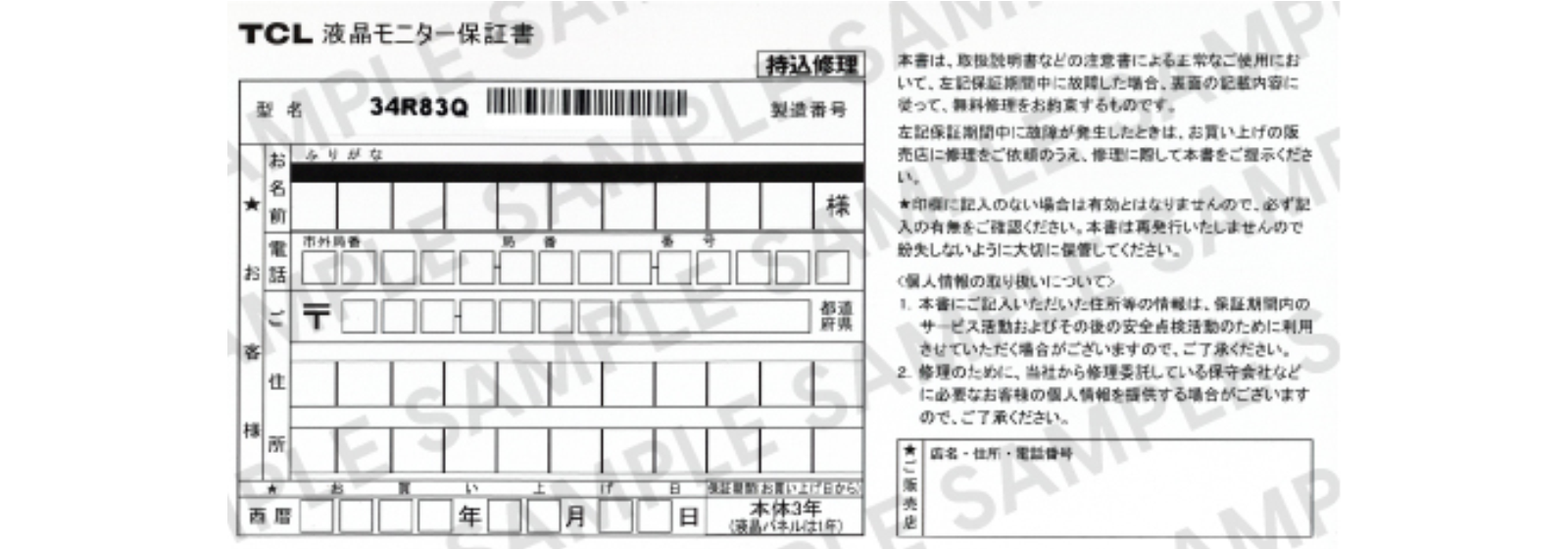 保証書を紛失された場合、または同封されていない場合は、TCLアフターサービスまでお問い合わせください。