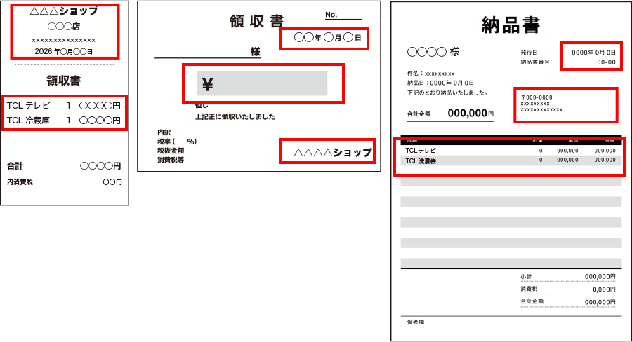 - ・販売店が発行する「購入年月日、型番、購入金額、販売店名、店舗名」が確認できるレシート、または領収書。