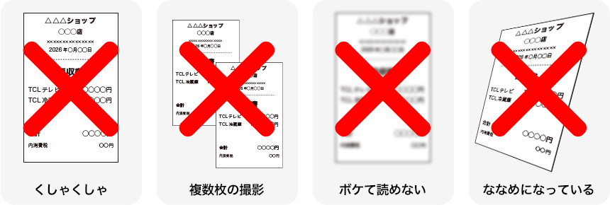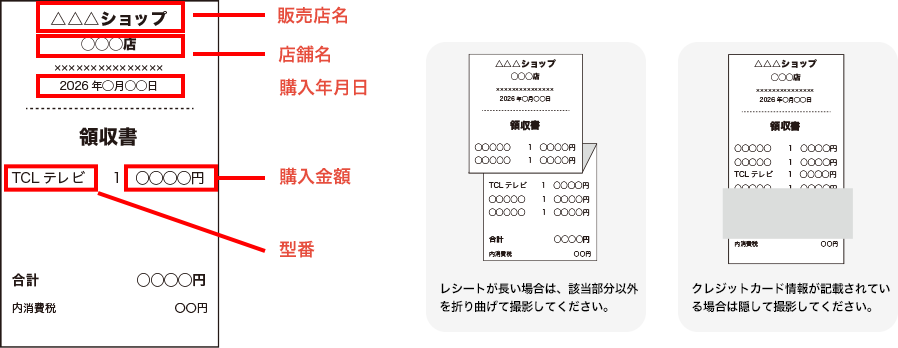 レシート撮影時は、販売店名、店舗名、購入年月日、型番、購入金額が見えるように撮影してください。