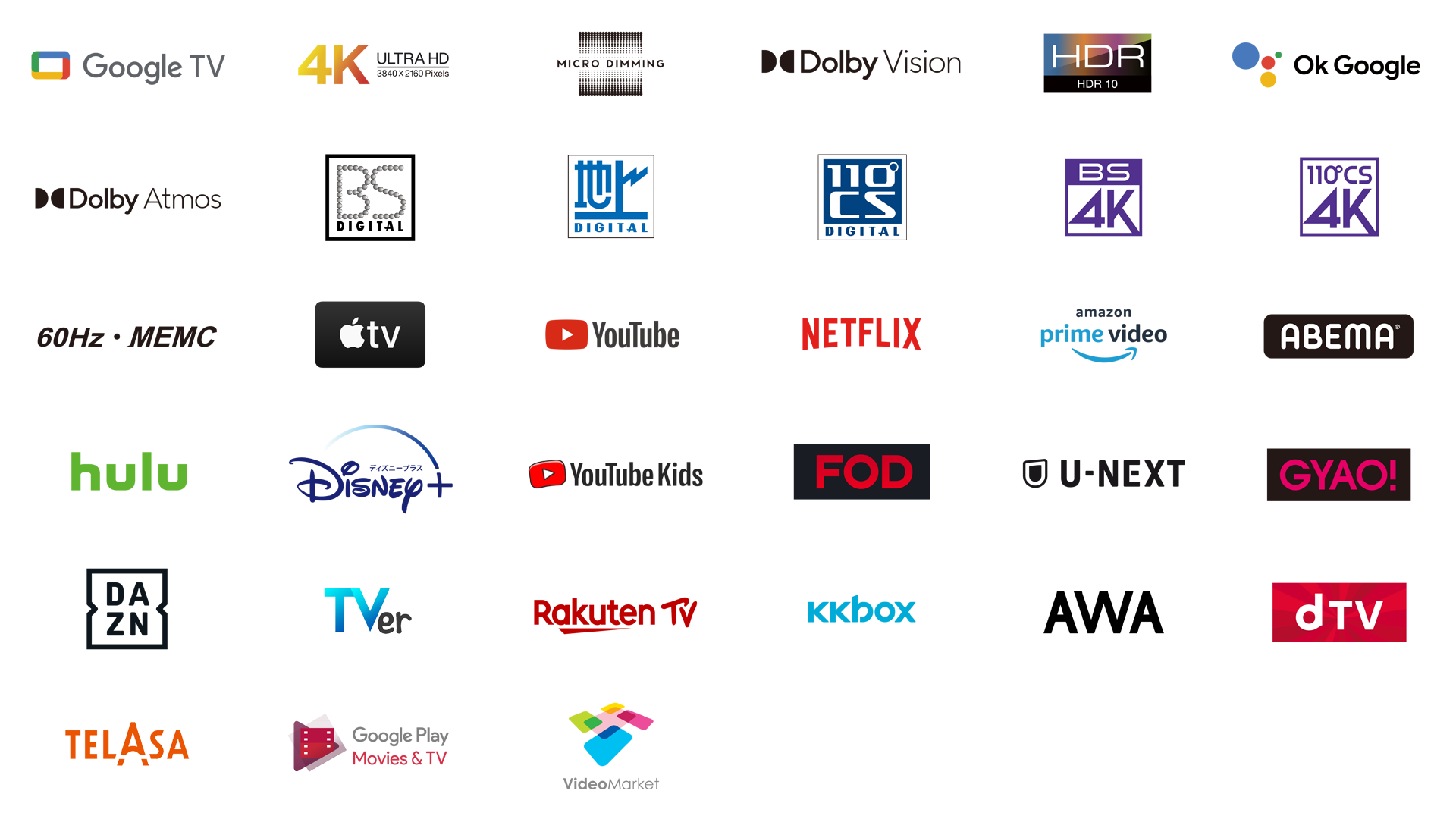 YouTube、Amazonプライムビデオ、NETFLIX、Hulu、 Disney+、Apple TV+ 、