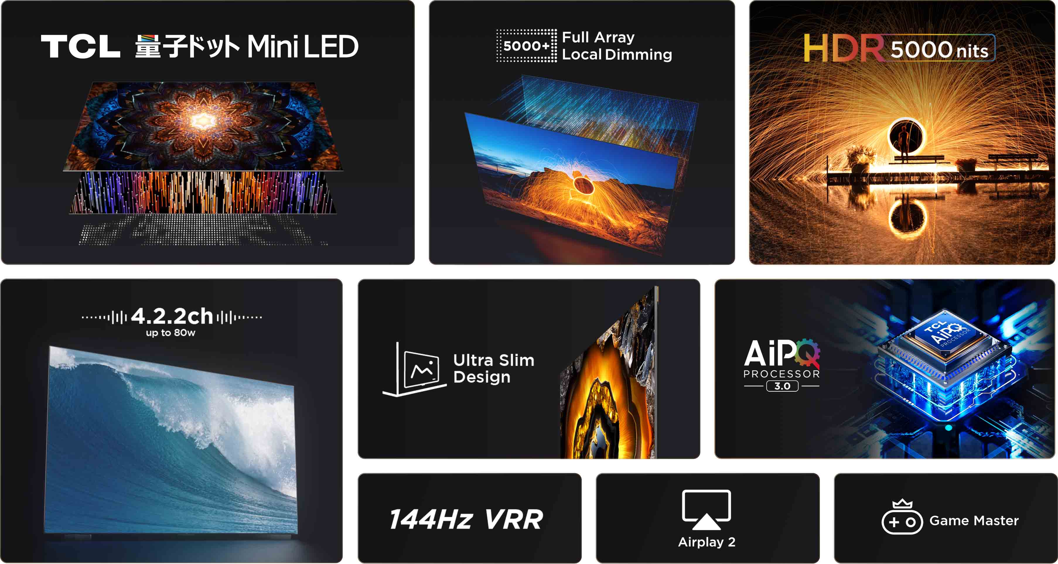 TCL X955は、リアルなステレオサウンドを提供し、部屋のあらゆる角に広がる音響体験を革新します。優れたONKYO 4.2.2ch 80W Hi-Fiシステムは、4つのメイン出力、2つの重低音スピーカー、2つの高音チャンネルにより、空間の隅々にまで響くステレオサウンド。