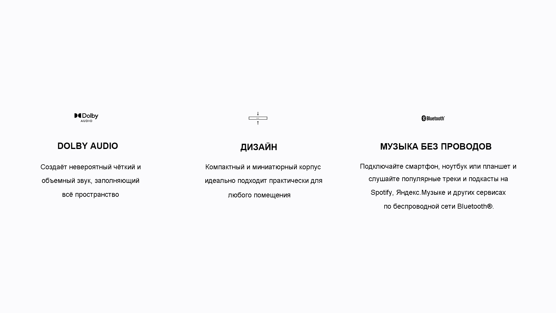 "Саундбар оборудован самыми популярными интерфейсами: AUX Audio (3,5 мм), оптический и Bluetooth®, благодаря чему вы можете перейти от распаковки к прослушиванию музыки за считанные минуты. *Оптический кабель входит в комплект."