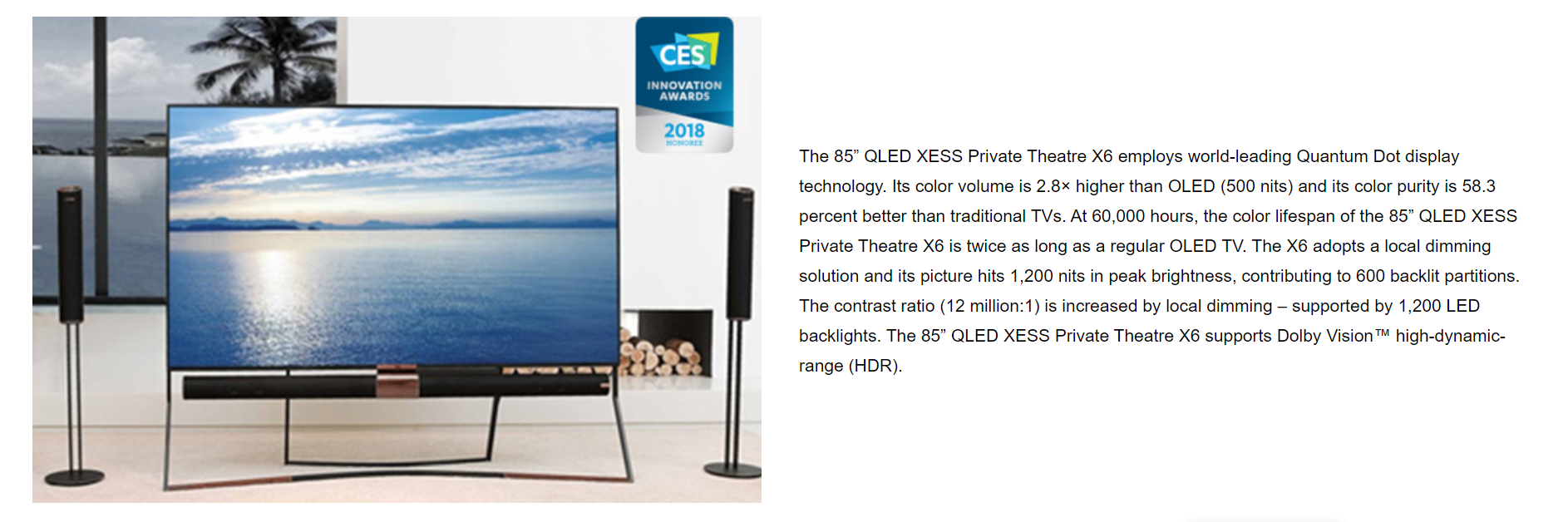 Recognised as one of the world’s largest and America’s fastest-growing television brands, we were honoured to have been named a CES 2018 Innovation Awards Honoree for our 85” QLED XESS Private Theatre X6. The decision was made by a preeminent panel of independent industrial designers, independent engineers and members of the trade media that judges cutting-edge consumer electronics products across 28 categories. Entries are evaluated on their engineering, aesthetic and design qualities, intended use/function, user value, unique/novel features and how the design and innovation of the product directly compares to other products in the marketplace.