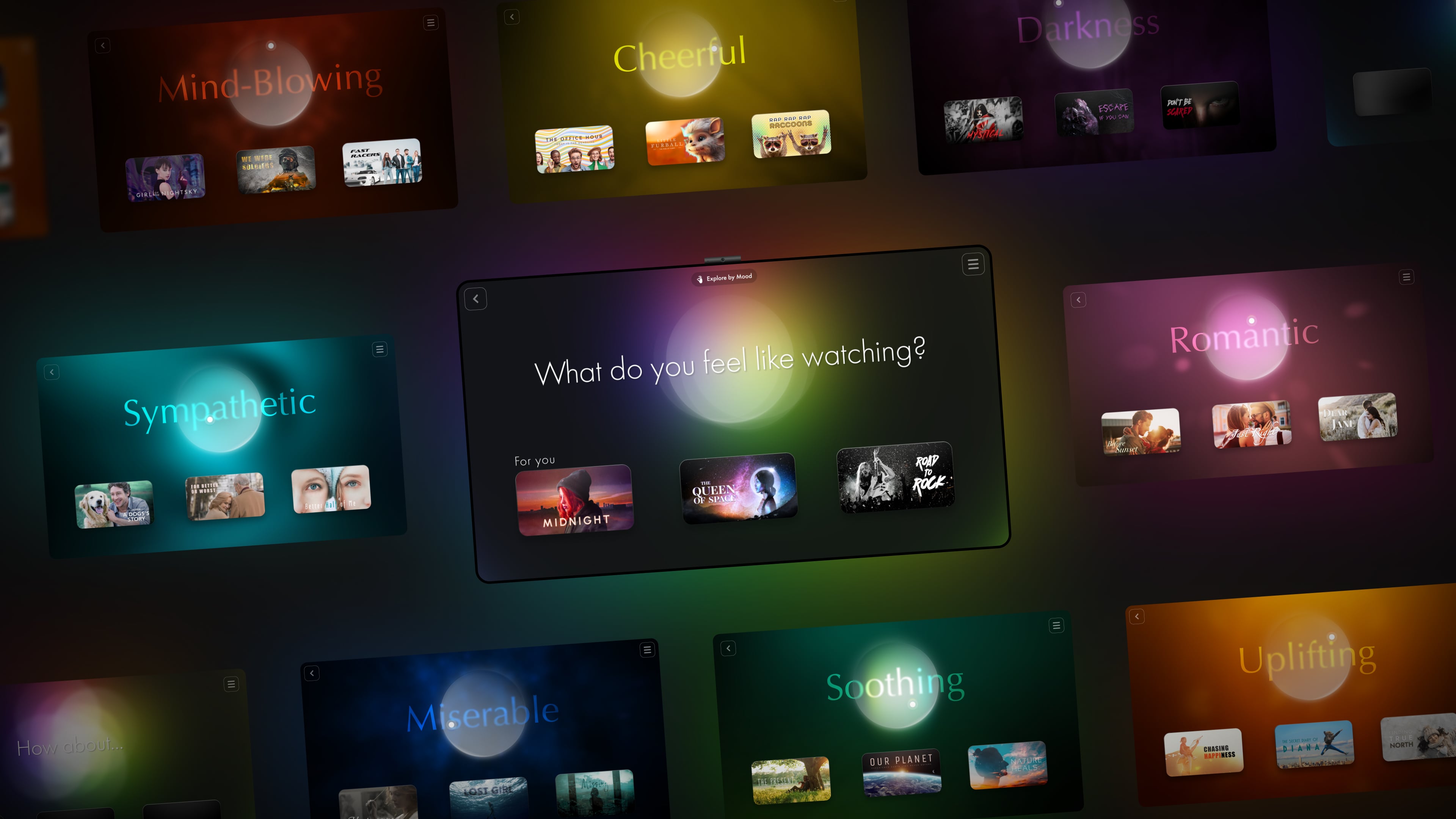 Movie Mood Explorer is a movie discovery experience on gesture controlled smart TV. With respect to the feelings of TV streaming users, it helps users with no specific content in mind to define what they feel like watching by taking mood as a core factor in the movie recommendation instead of traditional category. It allows users to experience that freedom of exploration with engaging interaction on contents from multiple providers all in one place. A browsing experience like never before.