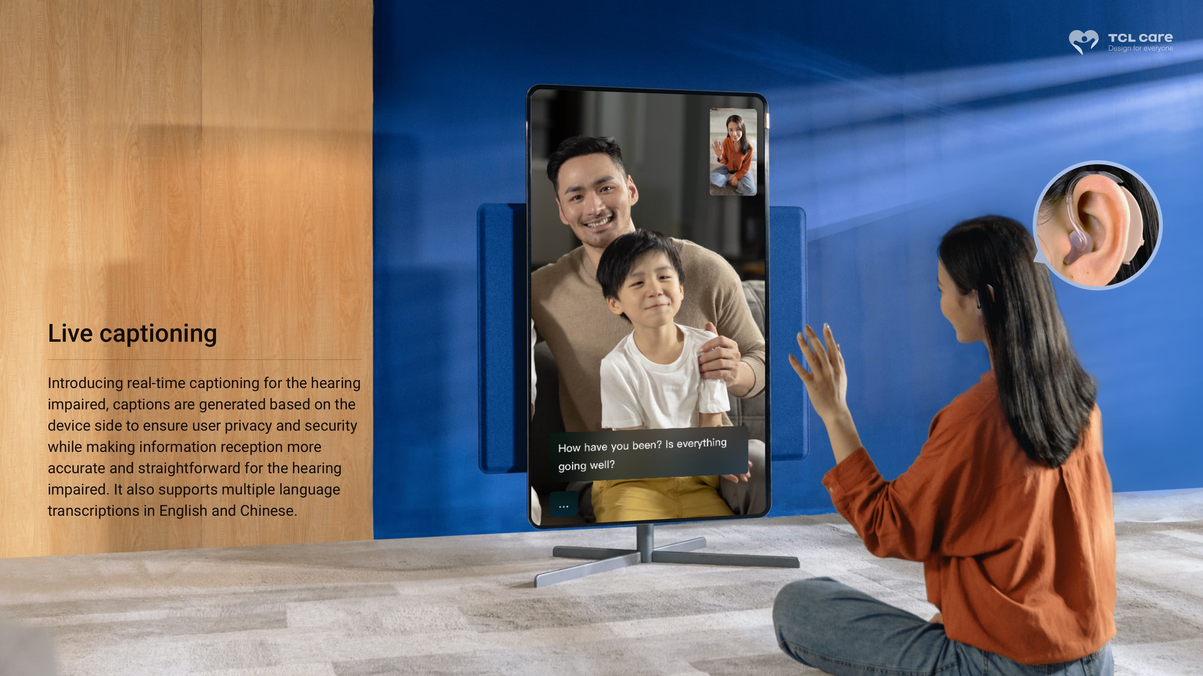 The International Paralympic Committee and the International Disability Alliance estimates that 15% of the world's population suffer from some form of disability. The epidemic has led to more people staying home. Going out, especially for the elderly, children and impaired people has become a luxury. As a truly user-centered company, we are committed to making everyone's experience easy. Watching TV is not just the right of normal people. As the industry's first TV care solution, “TCL care” covers everyone including the disadvantaged to offer a more friendly TV experience. We democratize TV experience for all people so that everyone can conveniently experience the rich and colorful life even within their homes.