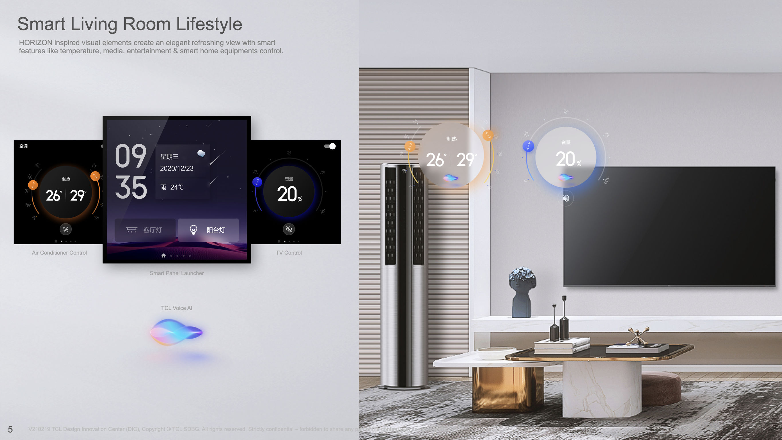 Users are overwhelmed by multiple user interface design styles in their day-to-day use of smart home products. TCL HORIZON UI creates a consistent visual and functional experience for users to intuitively operate and manage their smart home products seamlessly. The UI toolkit elements are inspired by the TCL brand logo, which consists of a square (infinite exploration of technology and future), and a circle (insights into consumers by putting people first). These elements have been combined with a horizontal line and progressive eclipse icons as the unifying design elements. The color palette relies on sunrise and sunset colors to emotionally connect with users.