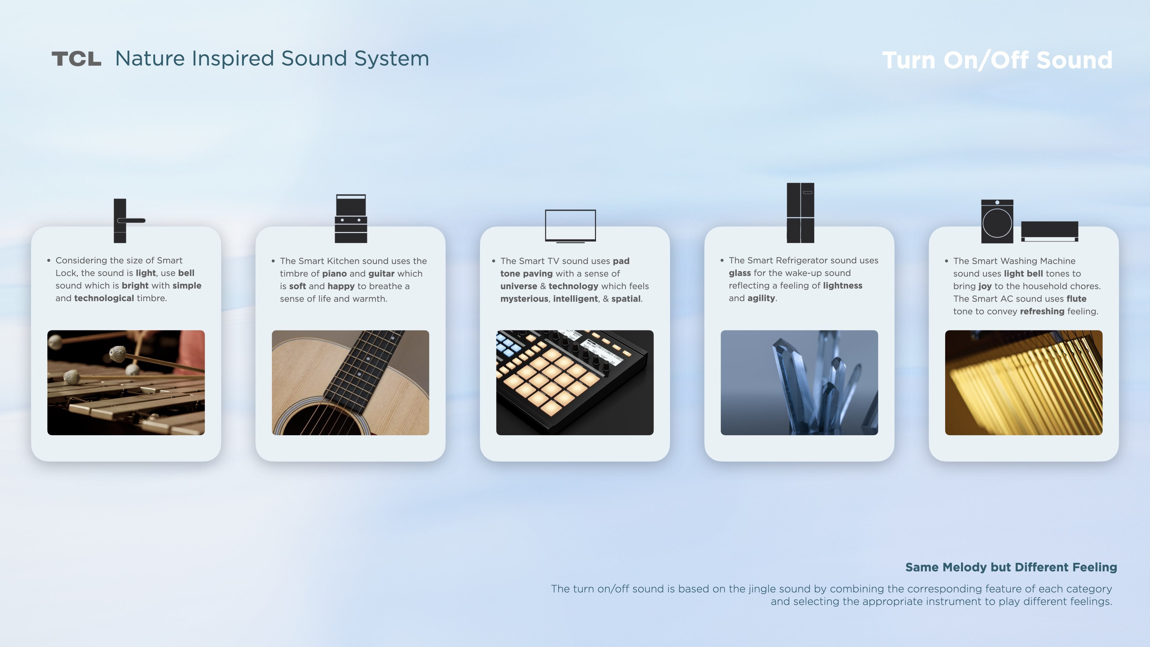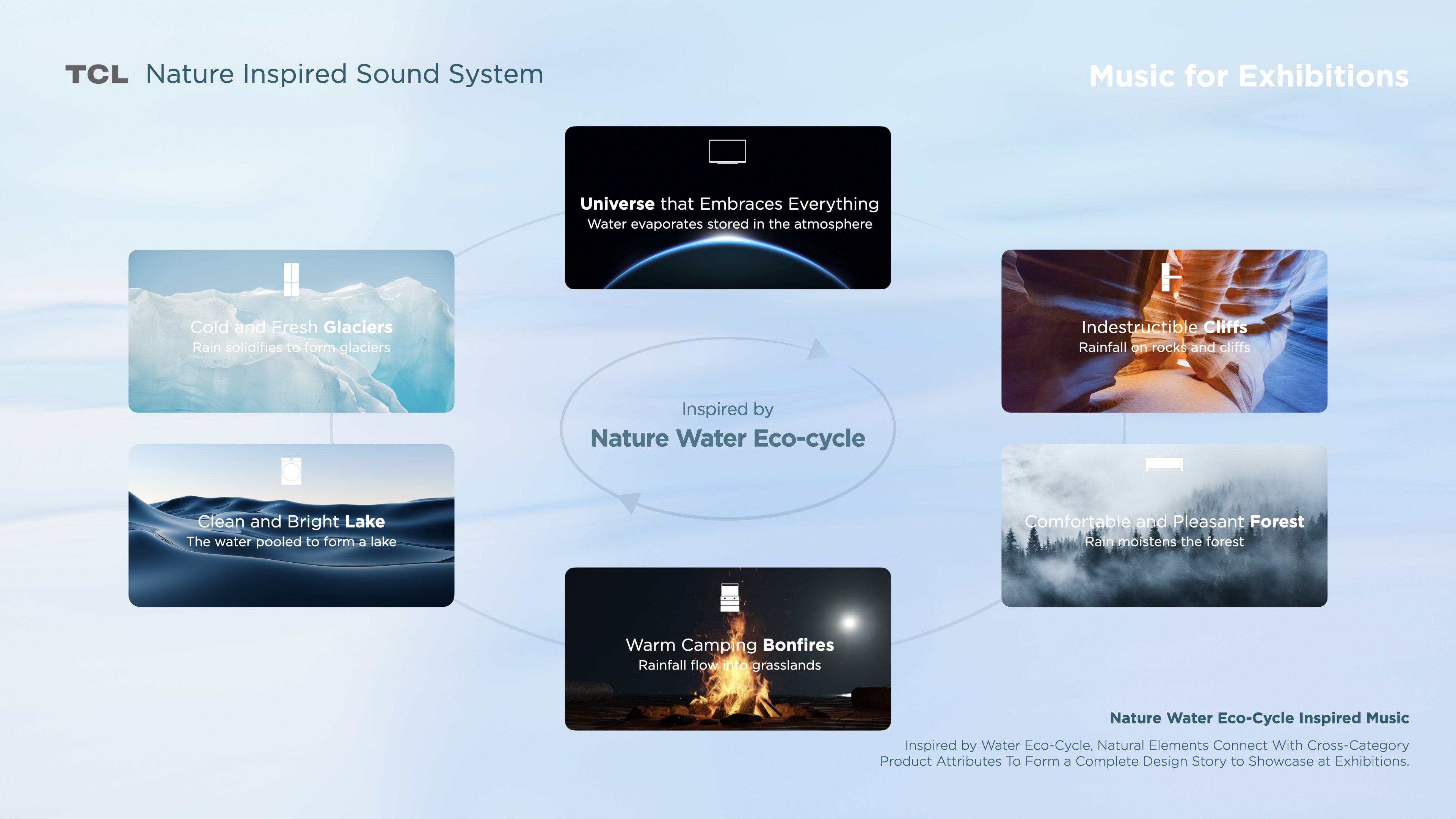 The post-pandemic new normal has made users eager to get away from their stressful daily life to embrace nature for healing their hearts and soul. This determines the theme of the TCL Nature Inspired Sound design story. We enrich and unify the user experience across TCL's full-set AIxIoT product series (TV, refrigerator, air conditioner, washing machine, smart lock, smart stove). We take inspiration from Nature Water Eco-cycle and nature elements to connect with cross-category product attributes to form a complete design story to take our users on a multi-sensorial user experience journey connecting our products with the comfort of nature.