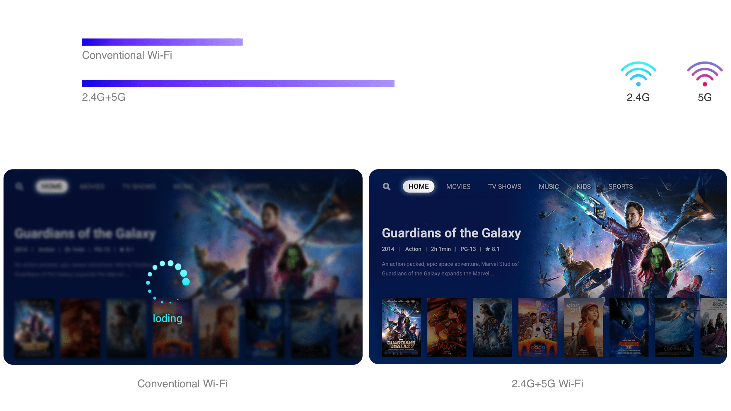 Stream faster, further, and more stably with 2.4G + 5G dual-band supported Wi-Fi. HDMI 2.1 supports higher video resolutions and faster refresh rates, with greater transmission speed and capacity – taking TV and gaming to the next level.