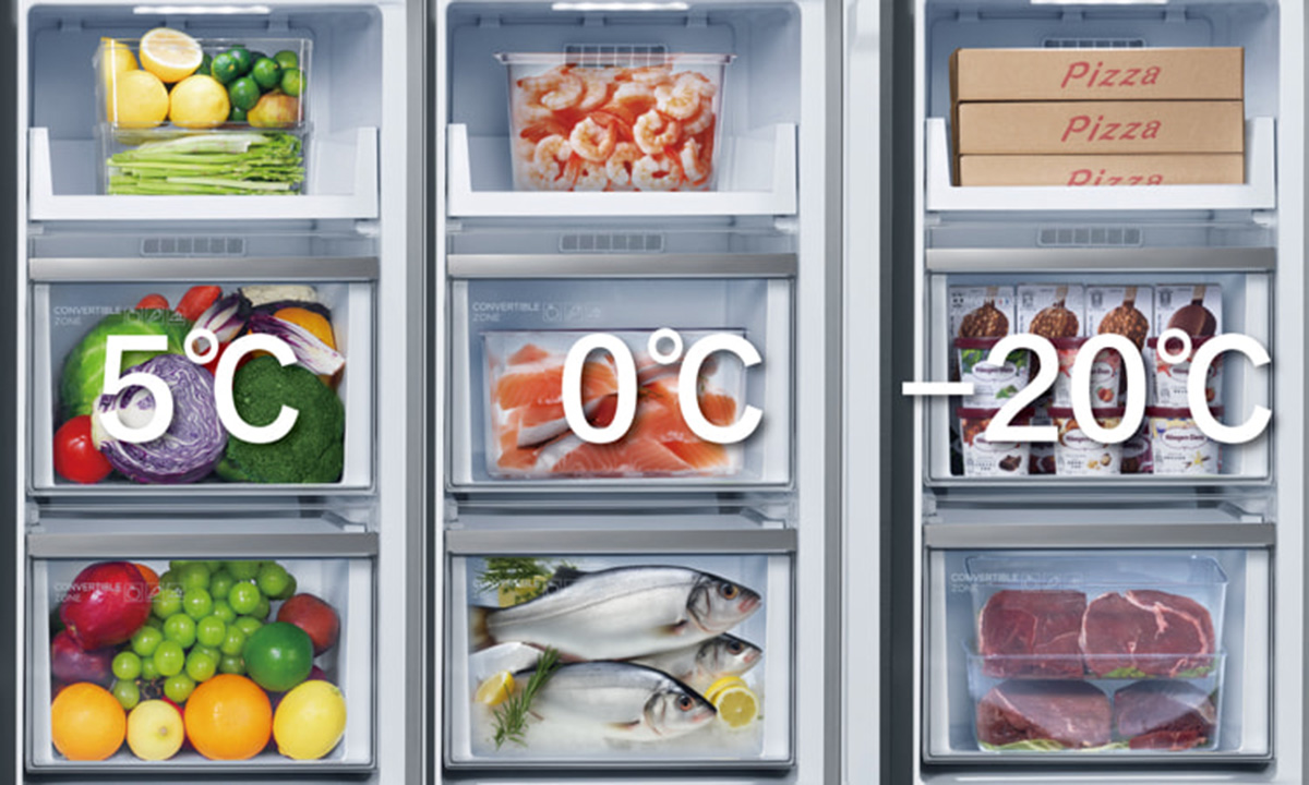 Convierte tu frigorífico y congelador como quieras. La temperatura de la zona convertible se puede cambiar de 5 ℃ a -20 ℃ a través del panel electrónico, según los alimentos de temporada que necesite una familia.