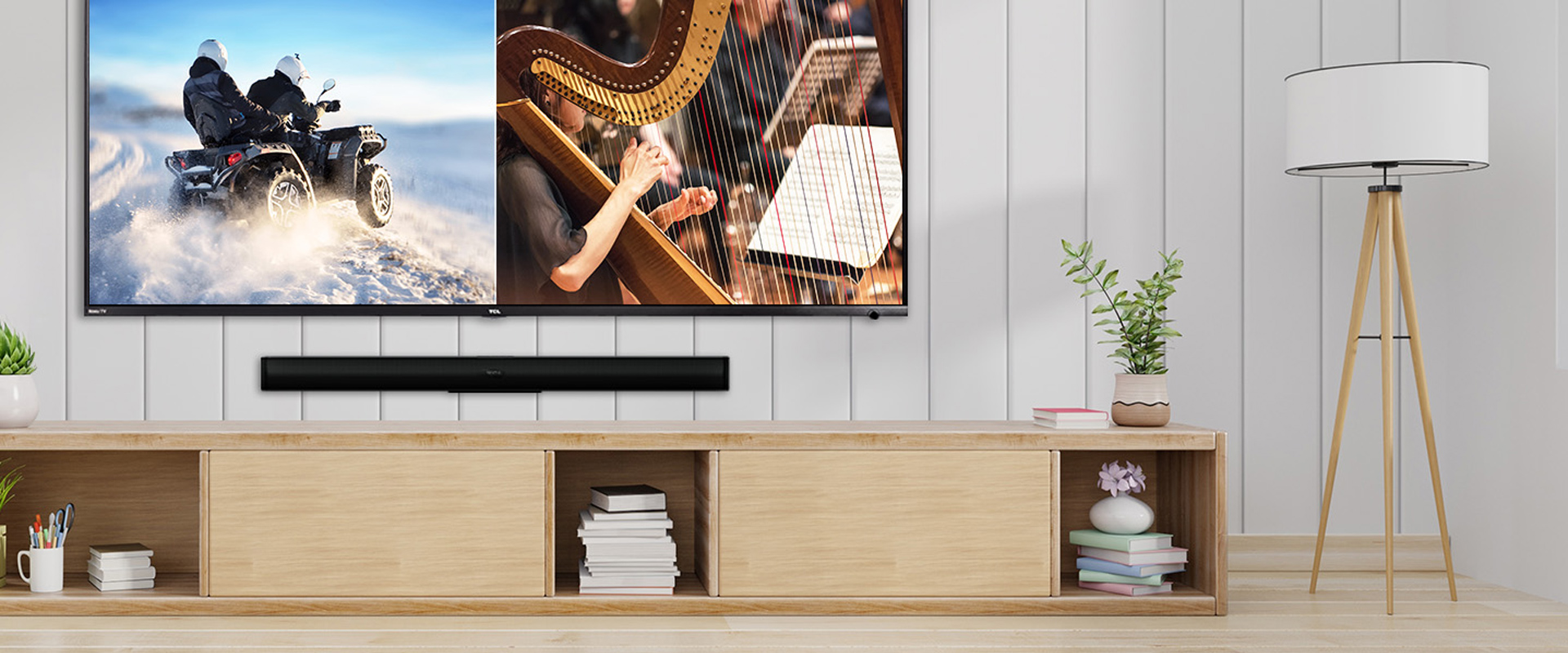 TS5000 vem com um design harmonizado que se mistura harmoniosamente com a sua TCL TV. A superfície brilhante e as curvas lisas vão chama a atenção. Usufrua do com superior da TV e do design sofisticado com a soundbar TS5000. Ideal para televisores de 43 polegadas e maiores.