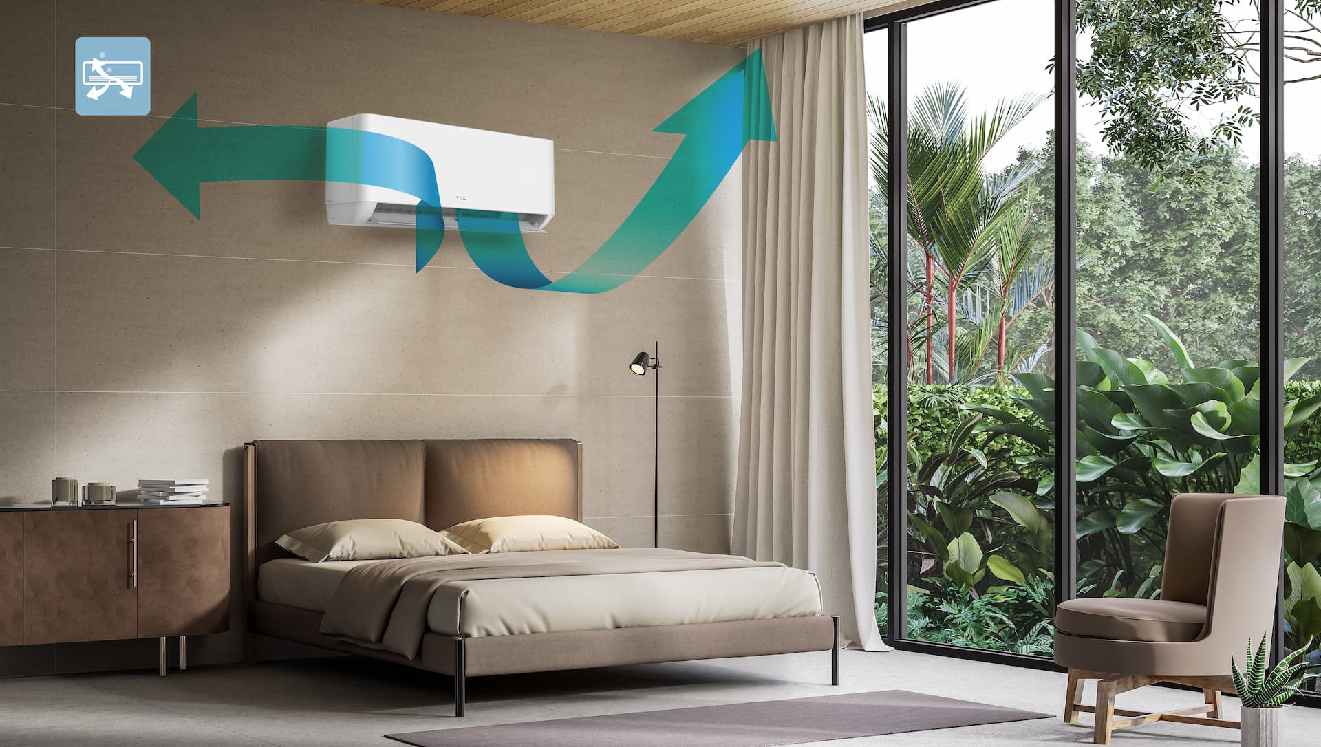 Fluxul de aer 3D TCL are funcția de oscilație automată orizontală și verticală. Furnizează un flux de aer mai confortabil, evitând suflul direct de aer pe piele și distribuind un flux de aer uniform tuturor din jur.