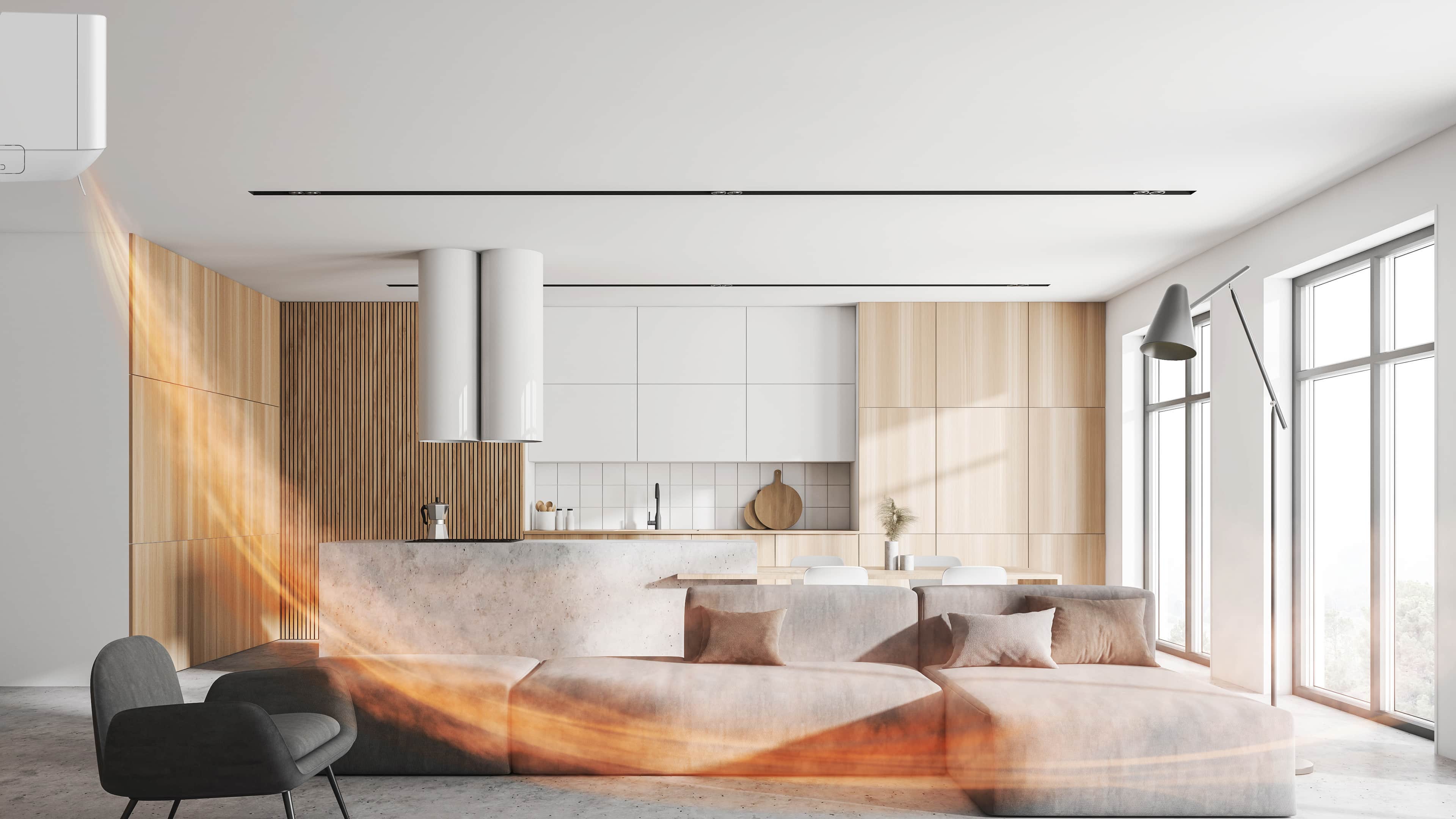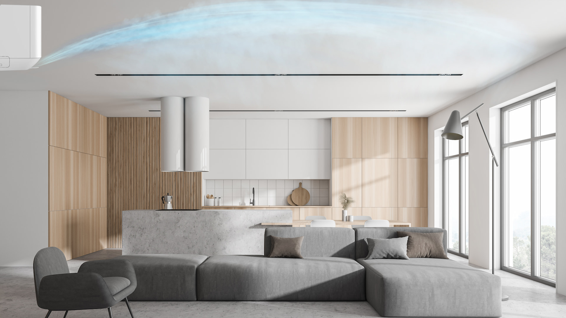 Fluxul de aer direcționat în sus coboară de la tavan pentru a crea o răcire imersivă.