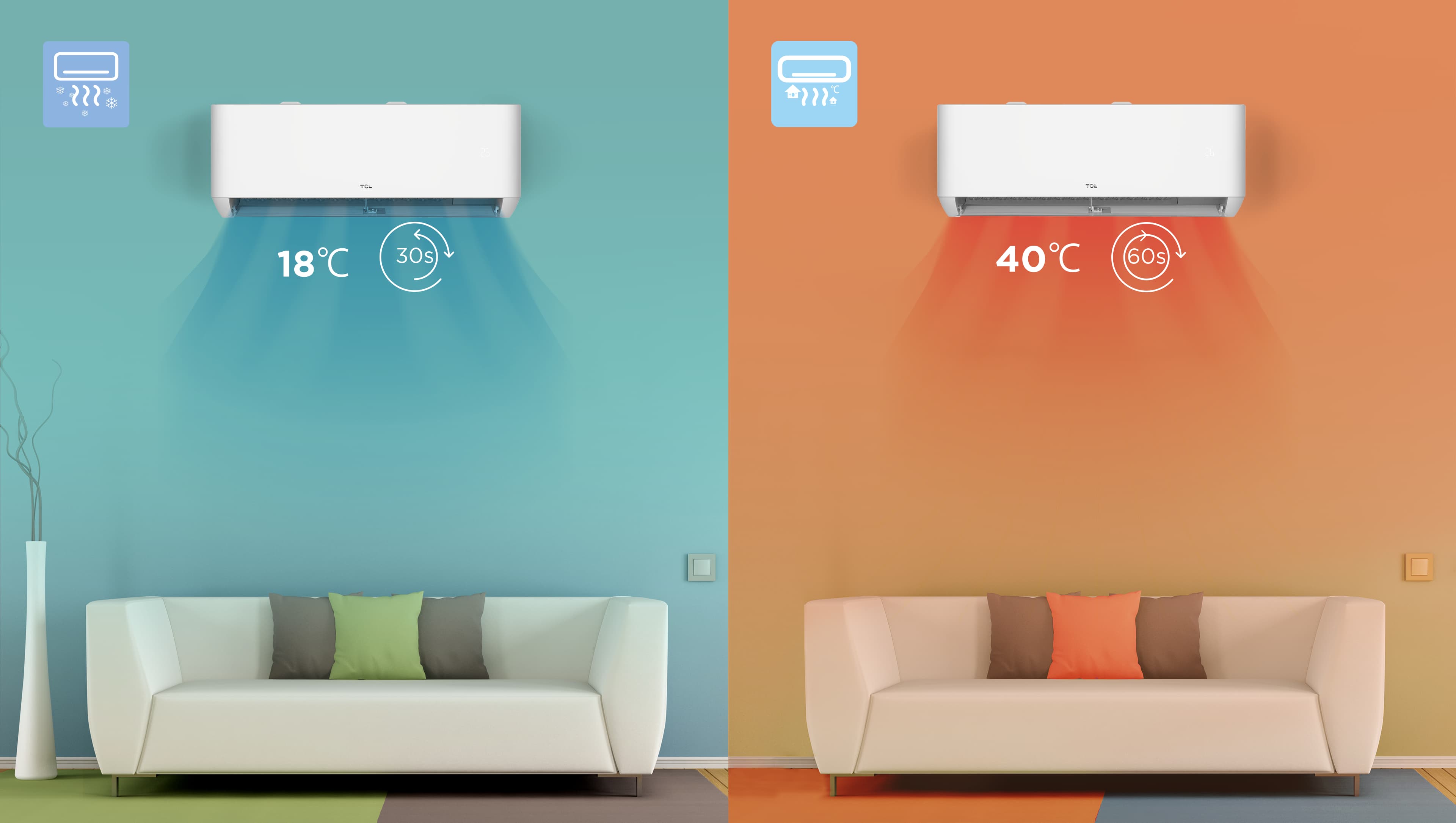 Compresorul de frecvență înaltă TCL asigură un confort mai rapid, aerul este livrat până la 18°C în doar 30 de secunde sau până la 40°C în doar 60 de secunde*. Porniți, personalizați temperatura și bucurați-vă de prospetime mai rapidă.