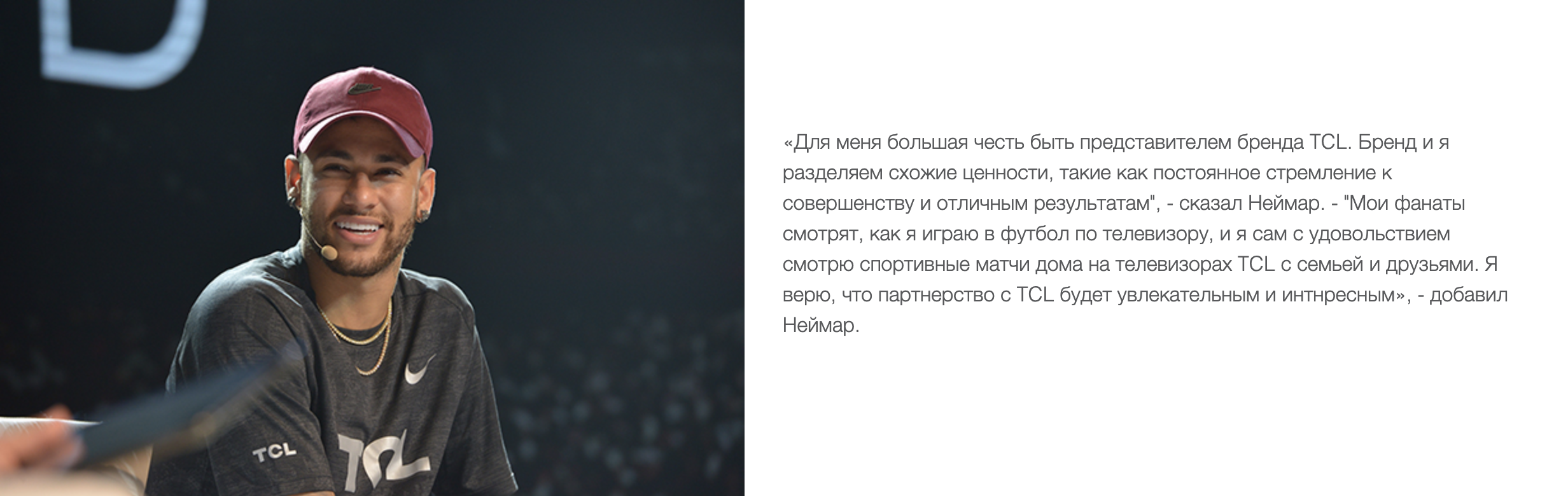 Неймар - один из самых влиятельных и известных спортсменов в мире - официально приступил к исполнению своих новых функций в качестве амбассадора бренда TCL: одного из ведущих мировых производителей телевизоров и лидера по производству бытовой электроники. Звездный футболист начал глобальную кампанию по продвижению бренда в 2018 году, на мероприятии в своем родном городе - Сан-Паулу.
