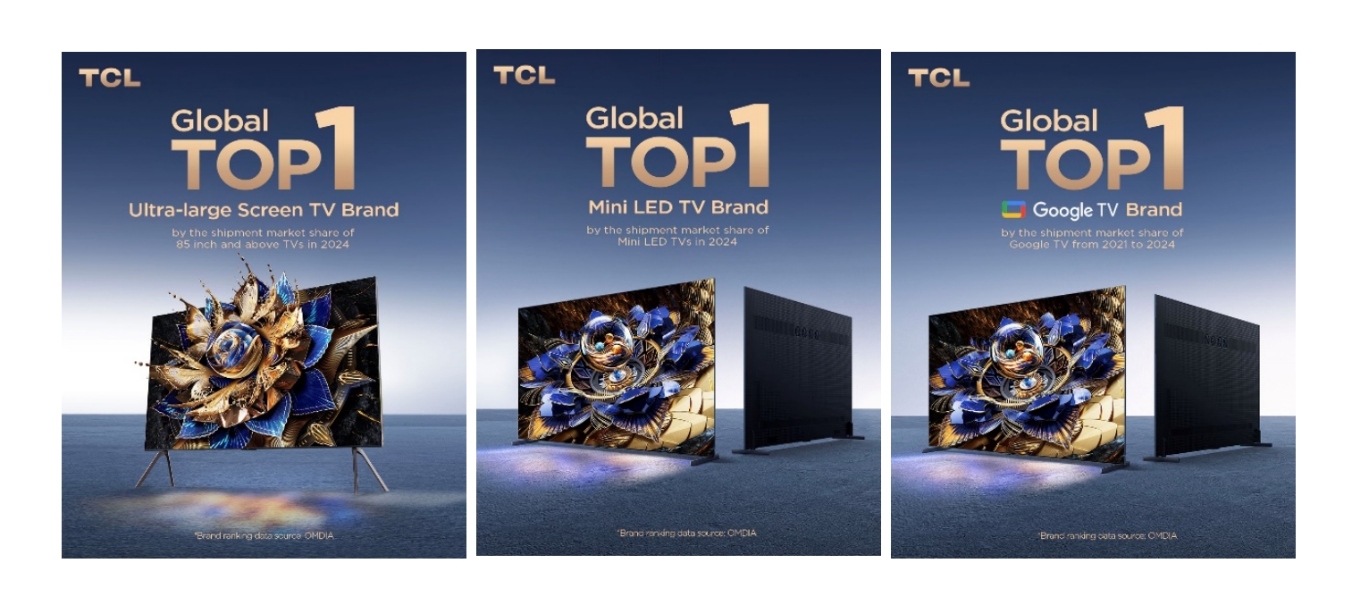 وبحسب أحدث بيانات صادرة عن "أومديا" Omdia، تصدّرت TCL الشحنات العالمية لأجهزة التلفزيون قياس 85 بوصة فأكبر في عام 2024 مُسجلة حصة سوقية تبلغ 22.1 %. وإضافة لذلك، ضمنت TCL المركز الأول في شحنات تلفزيونات ميني ليد بحصة 28.8 % كما حافظت على ريادتها في شحنات تلفزيونات جوجل على مستوى العالم خلال الأعوام 2021 إلى 2024.