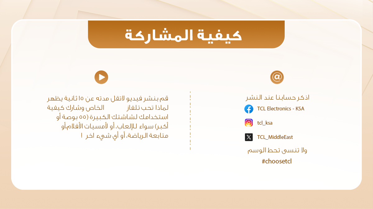 انضم إلى حملة #BigScreenMoment الخاصة بنا لتعزيز تجربة الشاشة الكبيرة الخاصة بك! تدعوك TCL لمشاركة تجربتك الفريدة مع أحدث أجهزة التلفزيون ذات الشاشة الكبيرة لدينا. سواء كانت ليلة سينمائية أو حدثًا رياضيًا أو تجمعًا عائليًا، نريد أن نسمع قصتك. ما عليك سوى مشاركة تعليقاتك على مواقع التواصل الاجتماعي المفضلة لديك للحصول على فرصة للفوز بجوائز رائعة. دعنا ننشئ #BigScreenMoments الخاصة بك، ونشارك قصصك ونظهر للعالم ما تدور حوله الشاشة الكبيرة الخاصة بك. نتطلع إلى سماع رأيك!