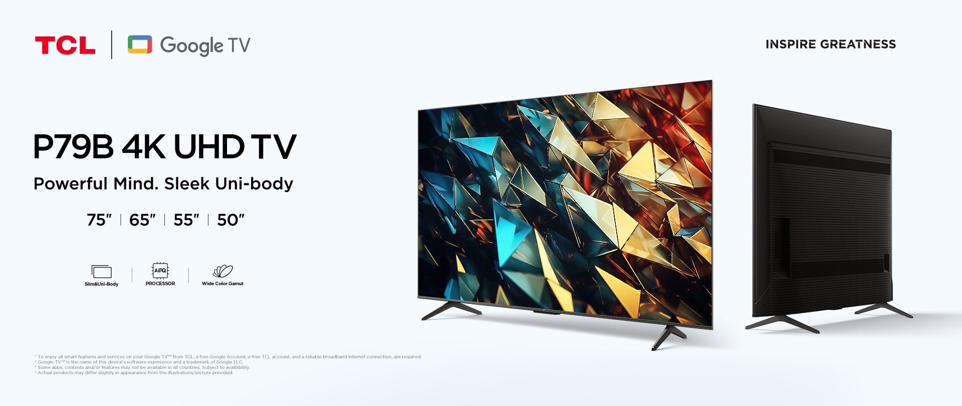 *To enjoy all smart features and services on your TCL Google TV, a free Google account, a free TCL account and a reliable broadband internet connection are required.