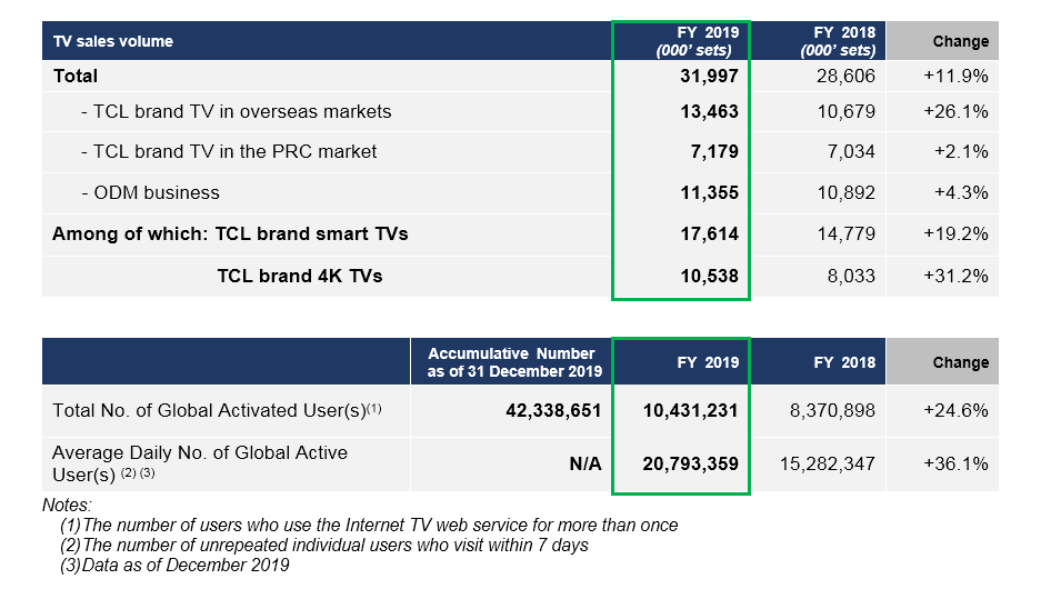 In terms of user operations, the Company has been improving TCL membership system as well as refined operation of content so as to enhance user loyalty. In 2019, the average daily time spent on TV per user steadily grew to 5.7 hours. As of 31 December 2019, the Company’s total number of global activated users increased by 32.7%, exceeding 40 million and reaching 42.34 million. In December 2019, the average number of global daily active users of the Company's Internet business worldwide reached 20.79 million, up by 36.1%. User base of Internet TV business continued to grow considerably.