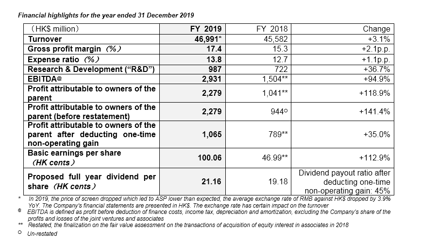 (30 March 2020, Hong Kong) – TCL Electronics Holdings Limited (“TCL Electronics” or “the Company”, stock code: 01070.HK) announced its annual results for the year ended 31 December 2019.