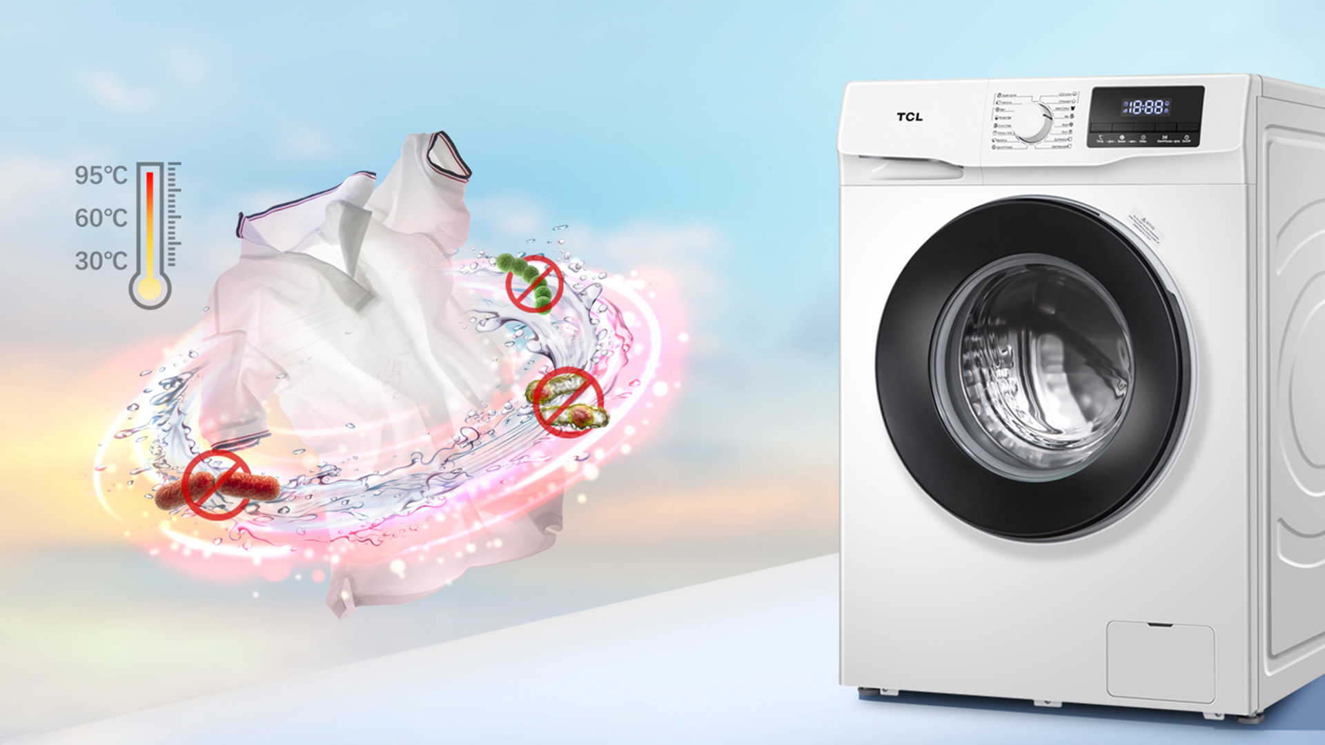 นอกจากนี้แล้ว เครื่องซักผ้า TCL ยังมีคุณสมบัติที่หลากหลาย ซึ่งจะช่วยให้สามารถใช้งานและบำรุงรักษาได้ง่ายยิ่งขึ้น ยกตัวอย่าง เช่น Heat Sterilization จะมีไอน้ำที่สะอาด ซึ่งจะผลิตขึ้นที่ด้านล่างของถังซัก เพื่อให้แน่ใจได้ว่าผ้าทั้งหมดจะอบในสภาพที่มีไอน้ำ หลังจากนั้น จะฆ่าแบคทีเรียอันเป็นสาเหตุของโรคภูมิแพ้ เช่น ไรฝุ่น เกสรดอกไม้ ขนของสัตว์ ฯลฯ และทำความสะอาดเสื้อผ้าของคุณให้สะอาด ถูกสุขอนามัย