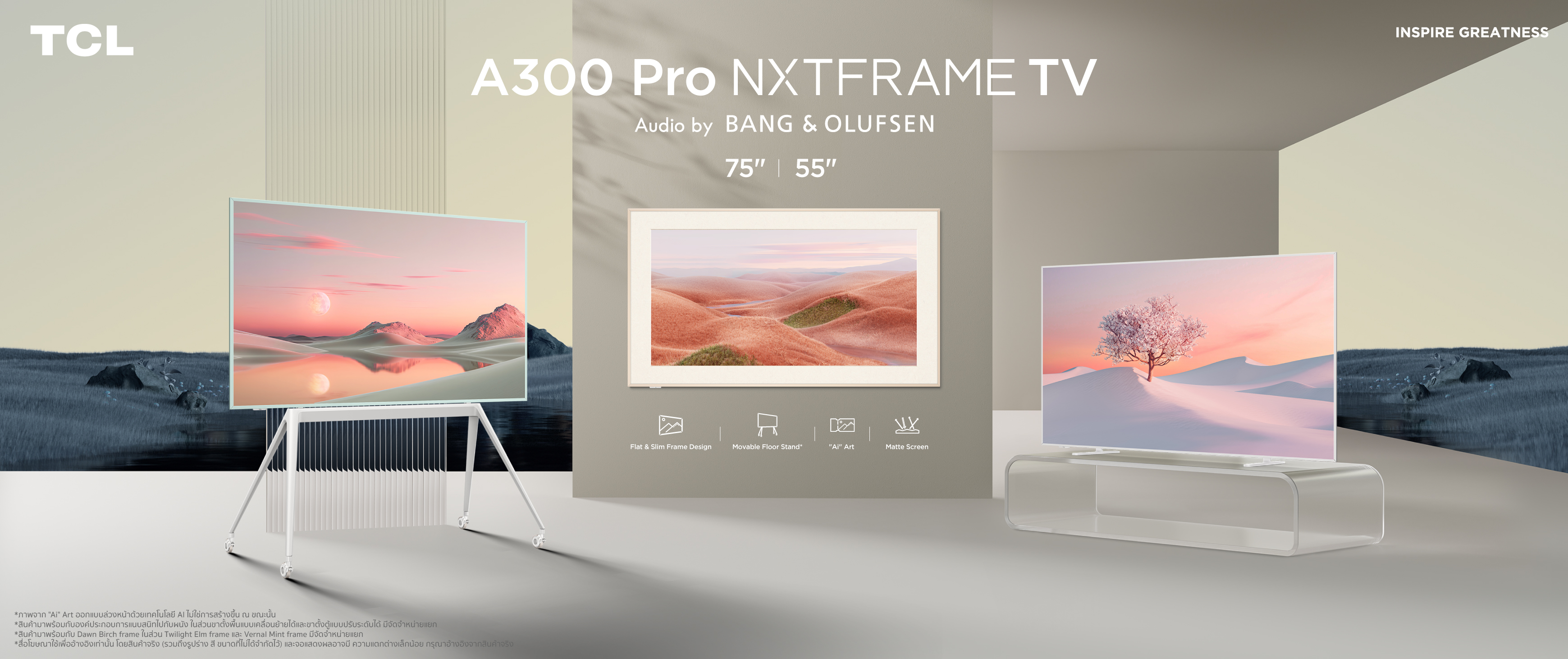 TCL A300 Pro NXTFRAME TV ไม่ใช่แค่ทีวี แต่เป็นผลงานศิลปะที่สามารถเสริมความงามให้กับพื้นที่ของคุณได้อย่างลงตัว ออกแบบมาเพื่อตอบโจทย์คนที่รักการตกแต่งบ้าน ทีวีรุ่นนี้มาพร้อมกับ Movable Floor Stand ที่สามารถเคลื่อนย้ายได้ง่าย ทำให้ทุกมุมของบ้านกลายเป็นโรงภาพยนตร์ส่วนตัวของคุณ นี่คือตัวเลือกที่สมบูรณ์แบบสำหรับผู้ที่ให้ความสำคัญกับดีไซน์และเทคโนโลยีไปพร้อมกัน