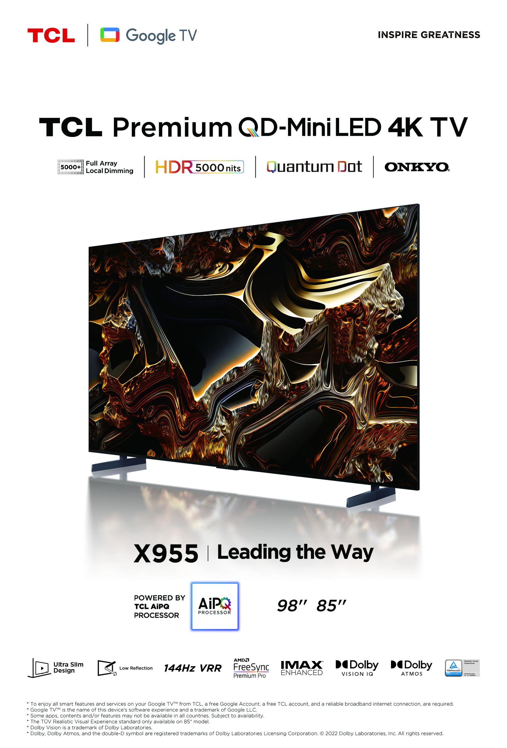 ตัวอย่างจาก Google TV รุ่น TCL X955 Premium QD-Mini LED 4K สมาร์ททีวีที่ผสมผสานดีไซน์บางเฉียบเข้ากับเทคโนโลยี QD-Mini LED ซึ่งให้ความสว่างถึง 5,000 nits/นิต และโซนหรี่แสงเฉพาะที่ 5,184 โซน และความคมชัดระดับพรีเมียม โปรเซสเซอร์คุณภาพภาพ AiPQ Processor 3.0 ล้ำสมัยช่วยให้ทุกฉากรู้สึกสมจริง