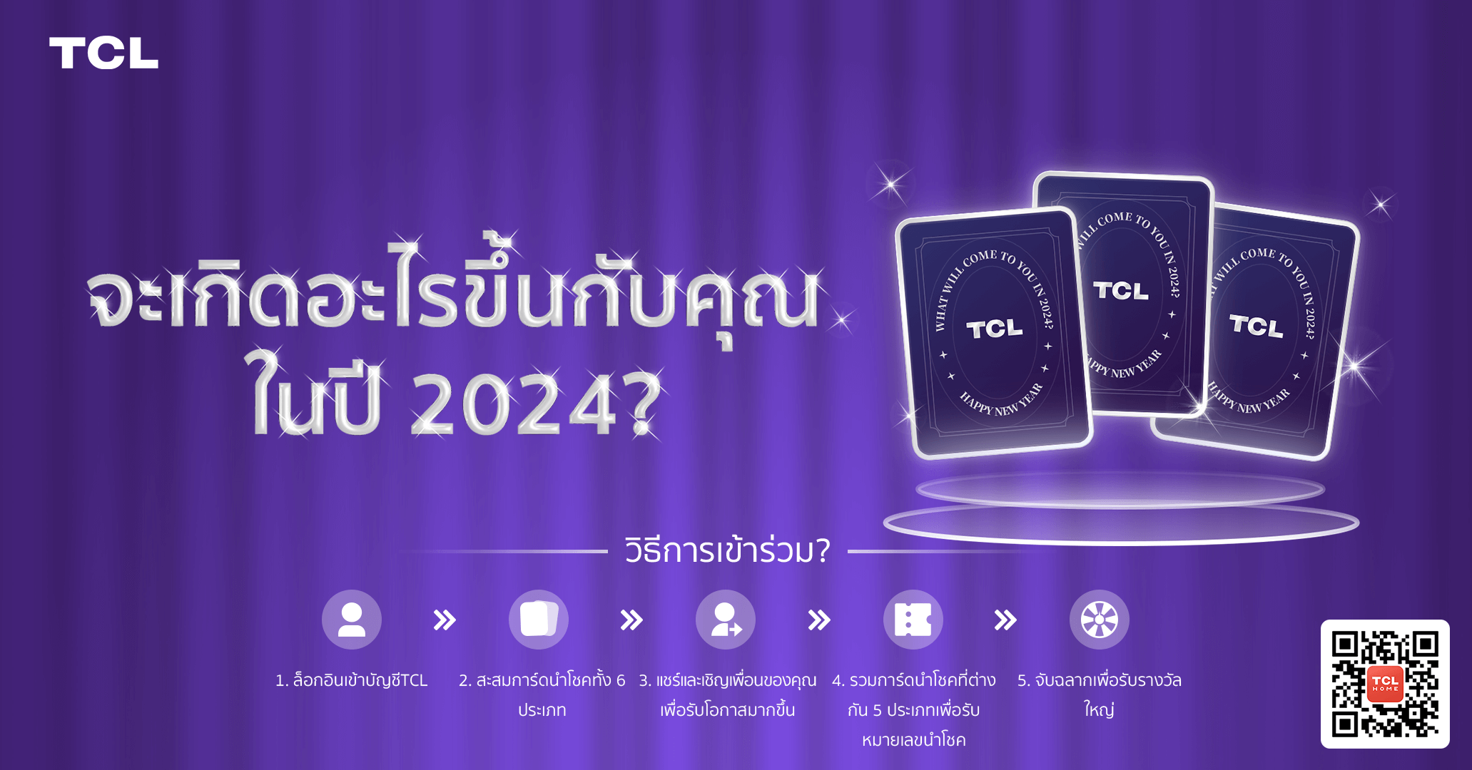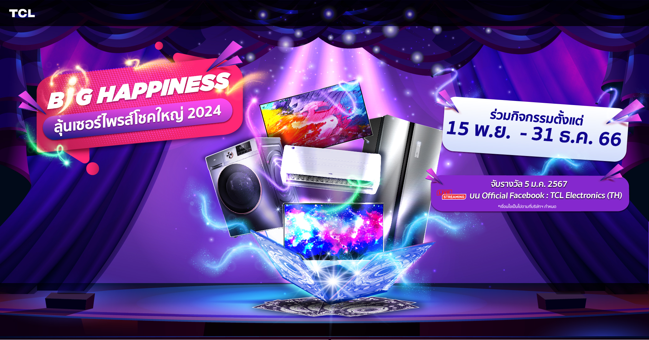 5. จับรางวัลผู้โชคดีและประกาศรางวัล ผ่านการ Livestream บน Official Facebook : TCL Electronics (TH) วันที่ 5 มกราคม 2567 และประกาศรางวัลภายในวันที่ 10 มกราคม 2567