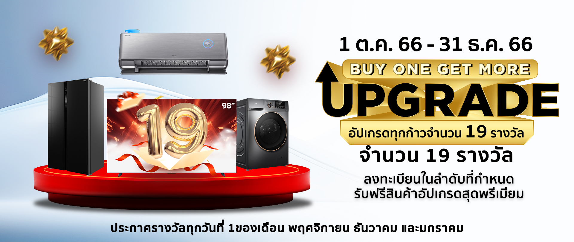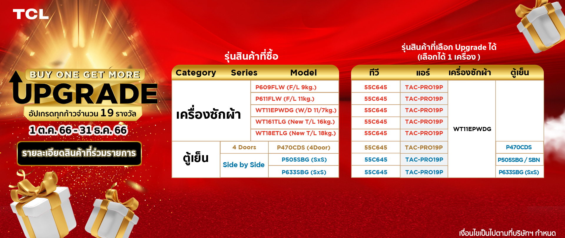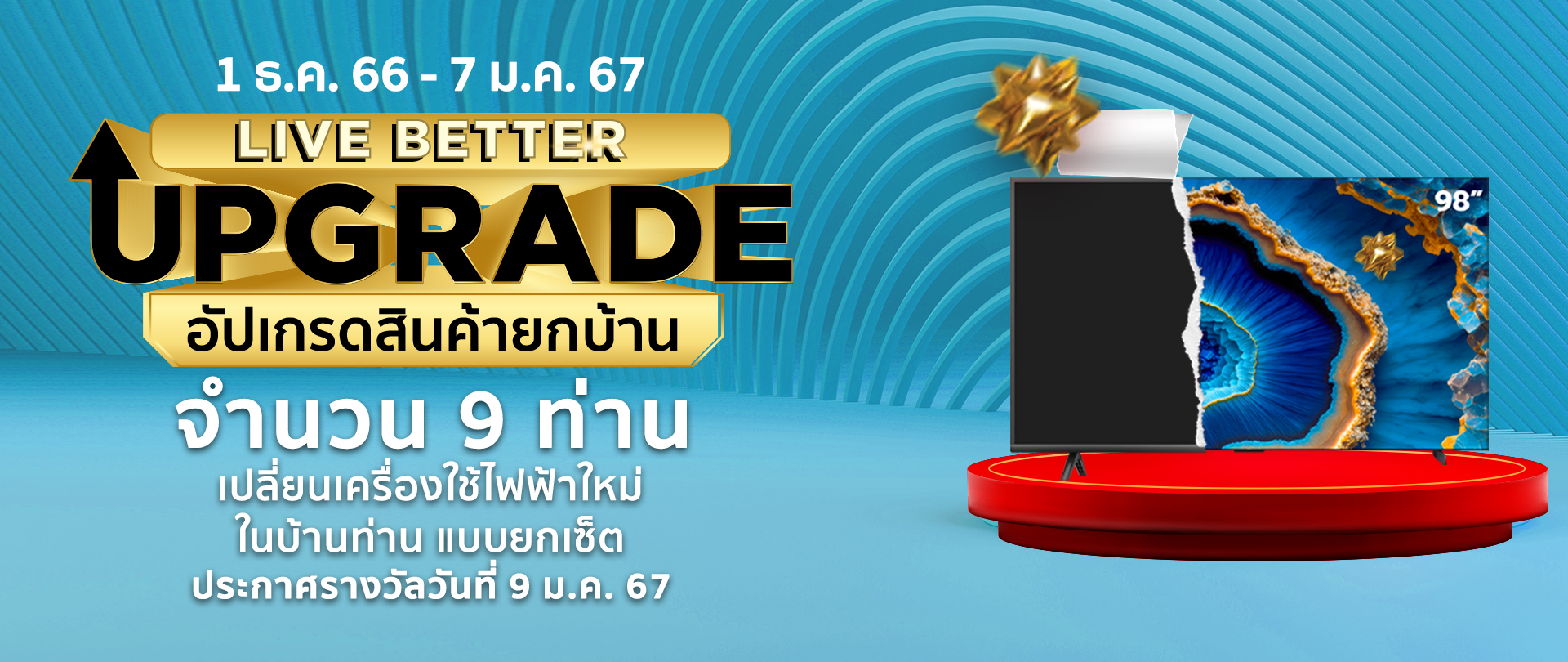 3. ลูกค้าสามารถเลือกรับของรางวัล Upgrade ได้ 1 เครื่อง เช่น ทีวี ตู้เย็น เครื่องซักผ้า หรือ เครื่องปรับอากาศ