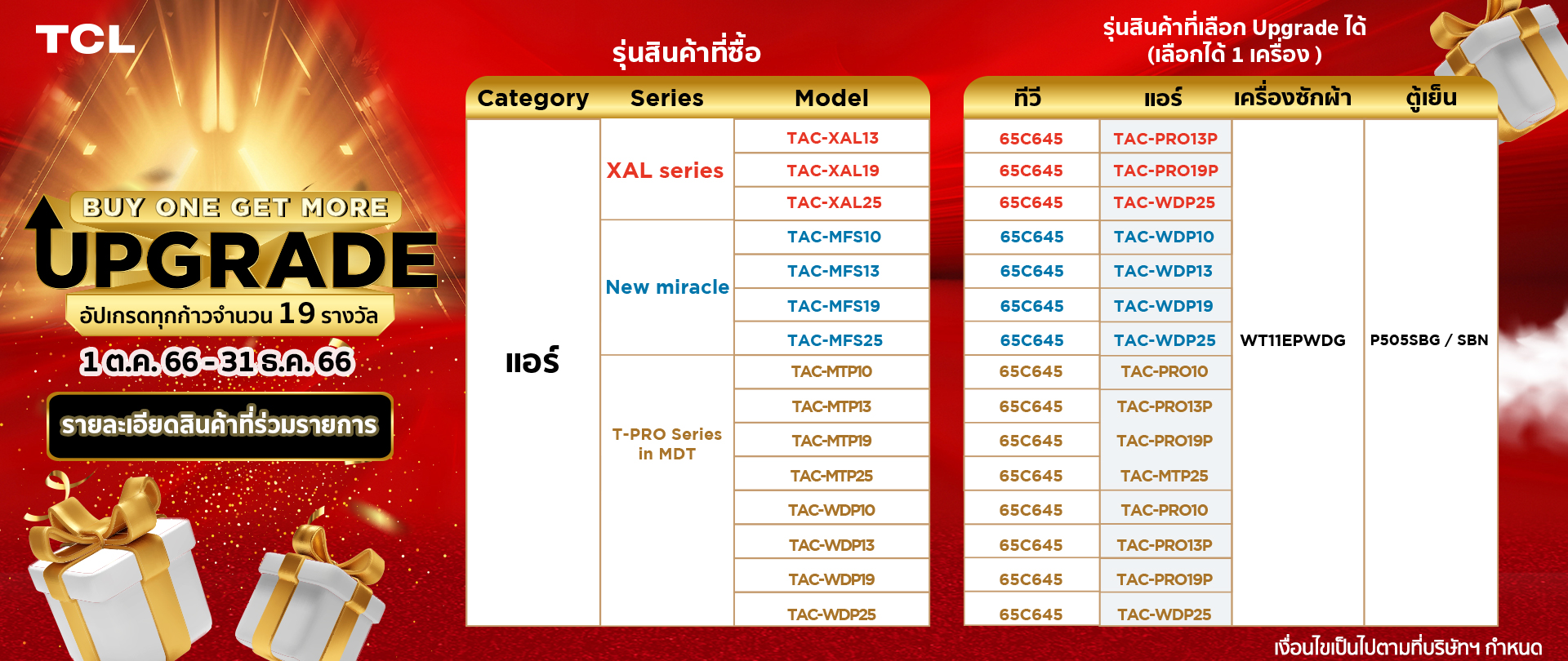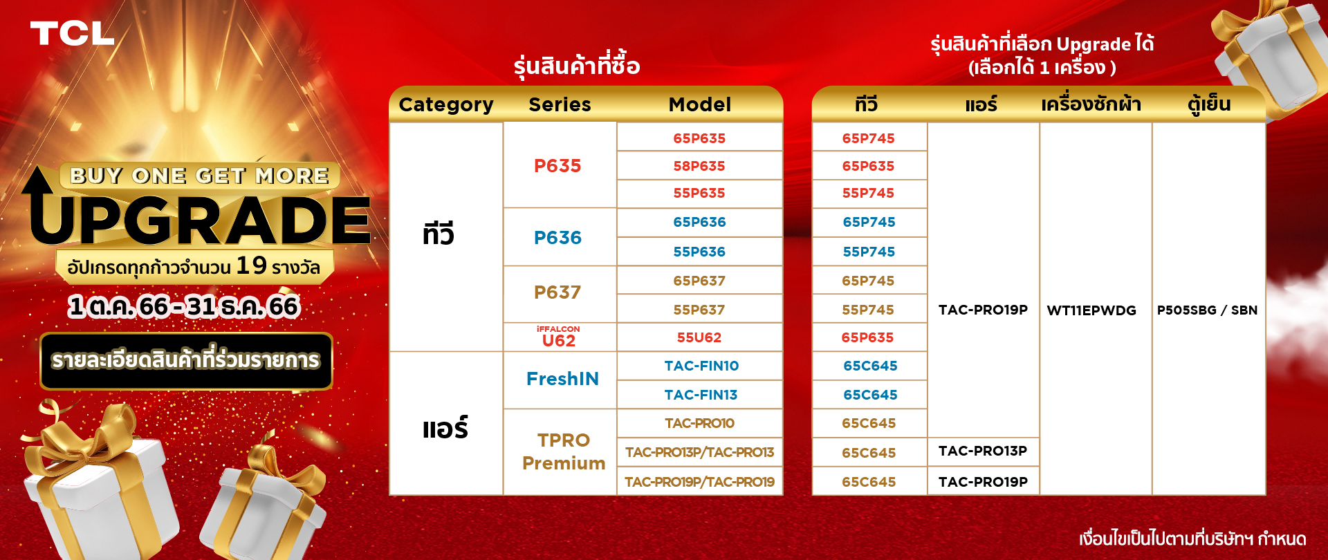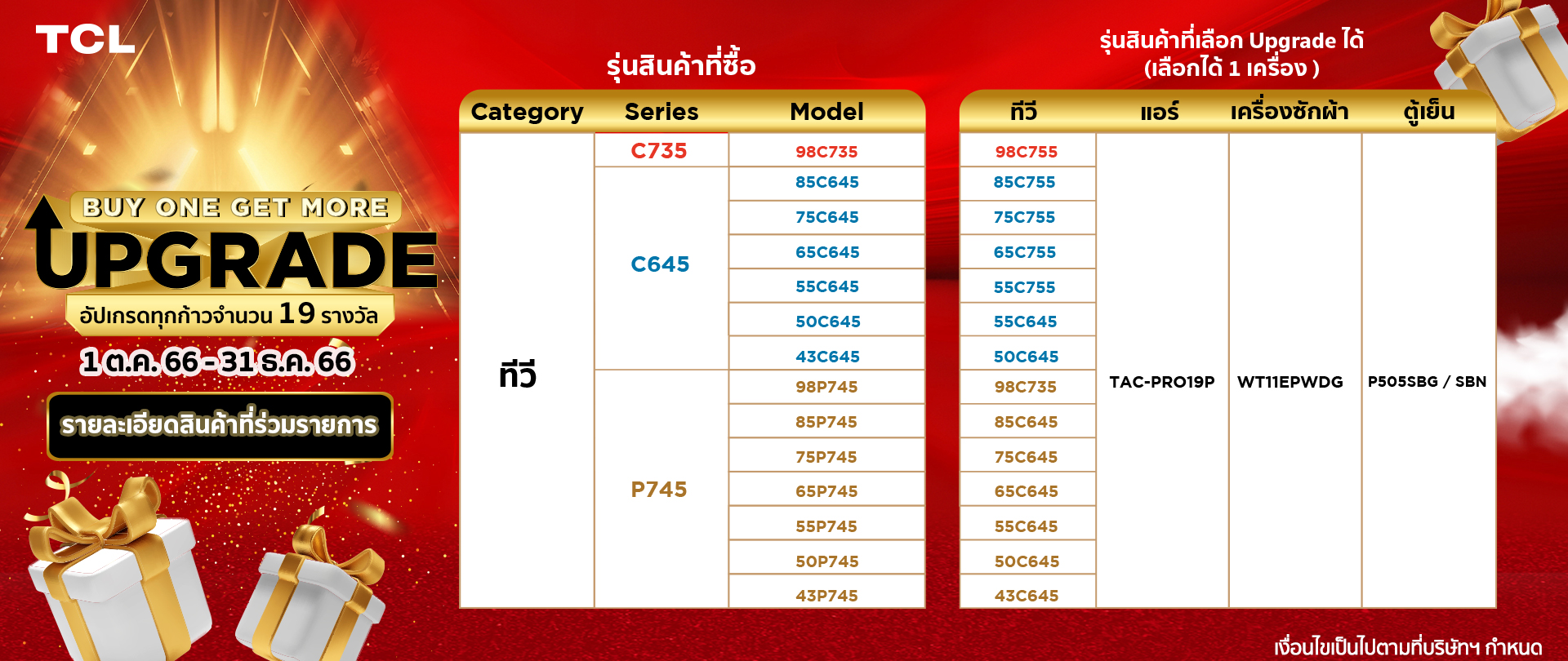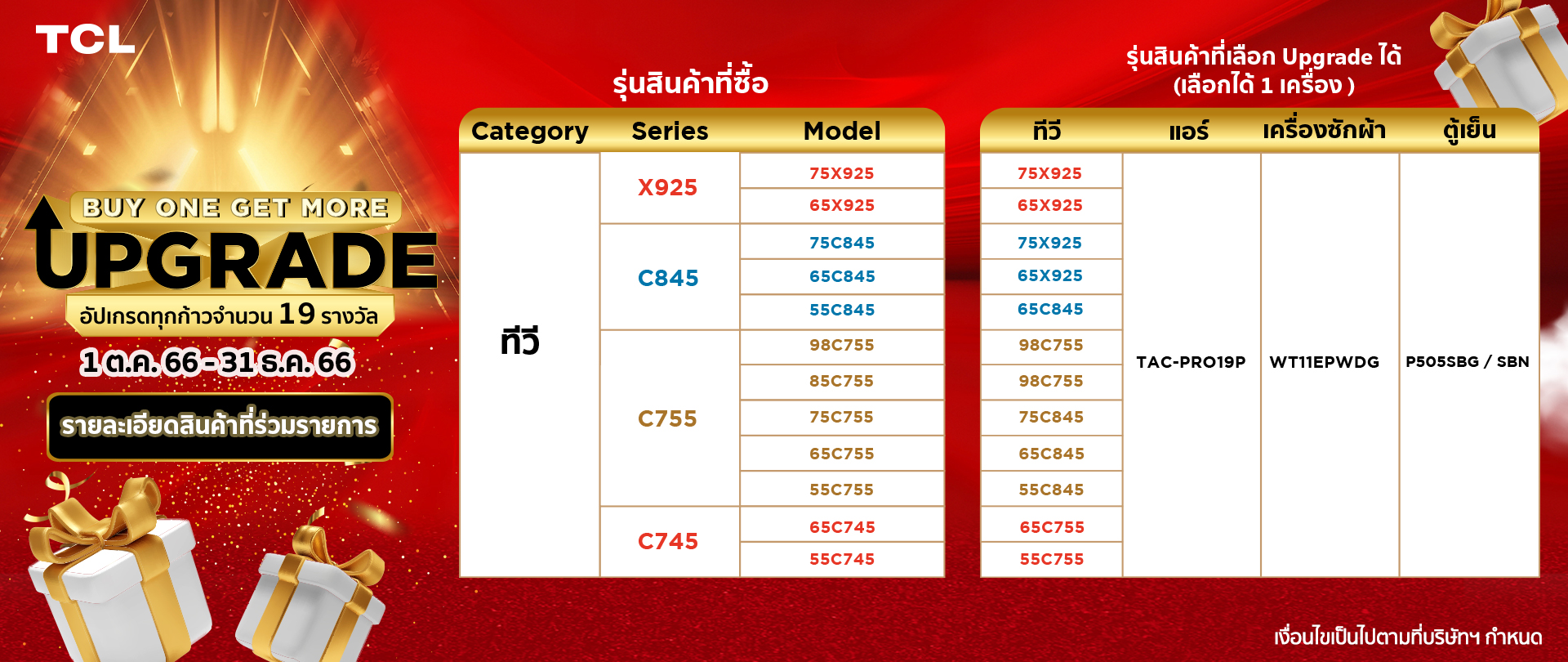 3. ลูกค้าสามารถเลือกรับของรางวัล Upgrade ได้ 1 เครื่อง เช่น ทีวี ตู้เย็น เครื่องซักผ้า หรือ เครื่องปรับอากาศ