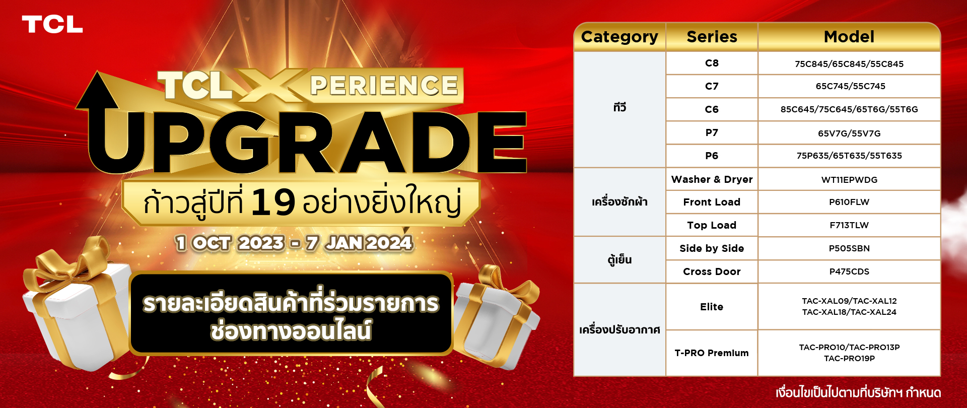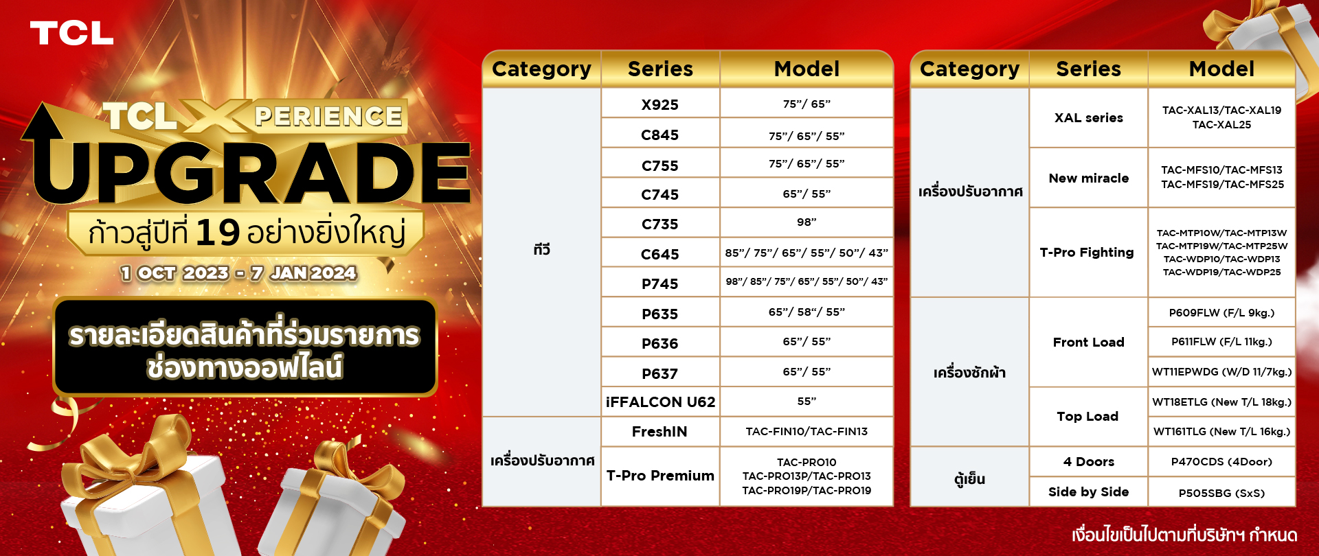 เพียงท่านซื้อสินค้า TCL ที่ร่วมรายการผ่านช่องทางออนไลน์หรือห้างสรรพสินค้า ร้านตัวแทนจำหน่ายทั่วประเทศ สามารถลงทะเบียนเข้าร่วมกิจกรรมเพื่อลุ้นรับรางวัลจาก TCL มูลค่ากว่า 6,000,000 บาท และสามารถร่วมกิจกรรมอื่นๆ ได้ตั้งแต่วันที่ 1 ตุลาคม 66 – 7 มกราคม 67