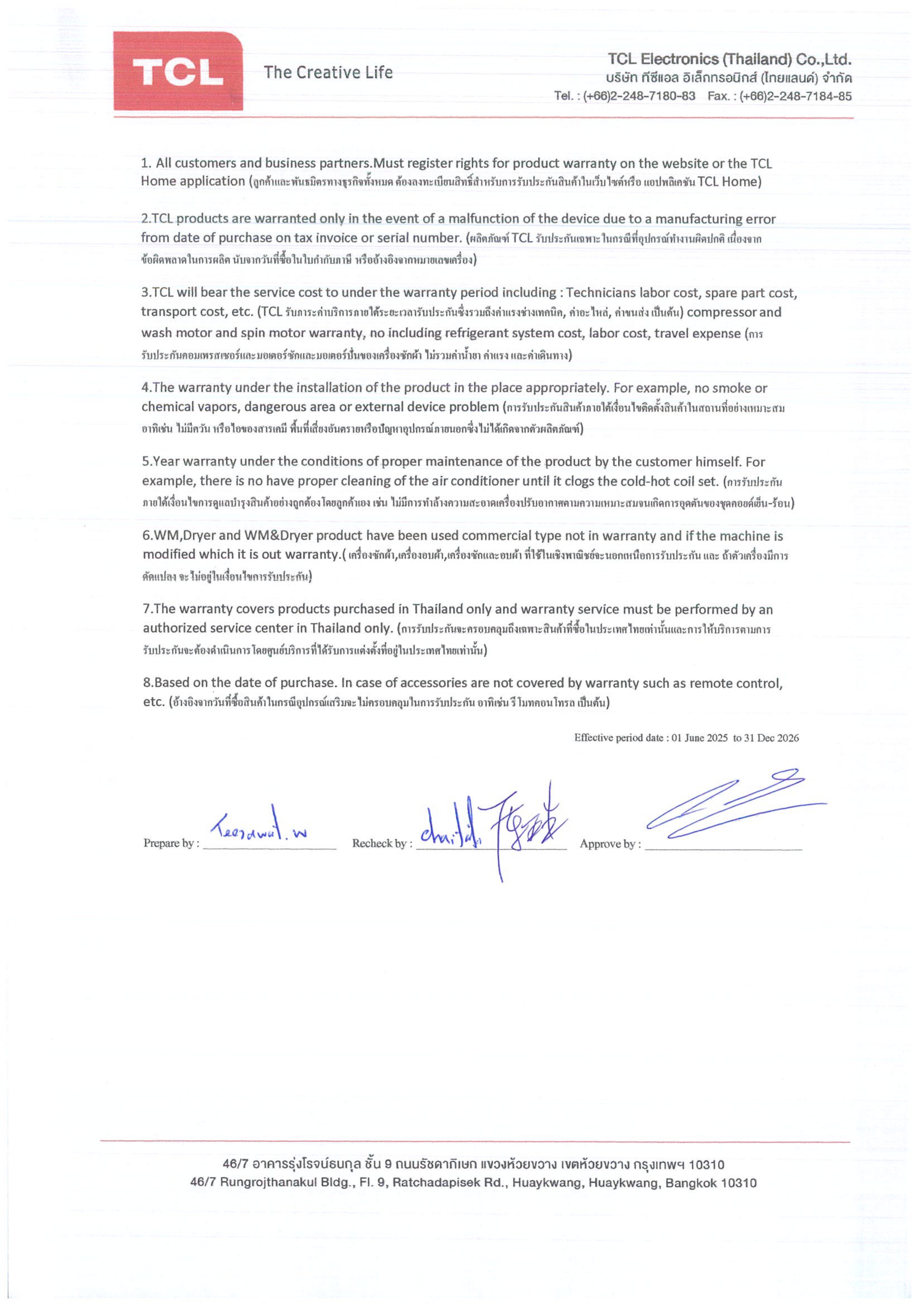 นโยบายการรับประกันที่ชัดเจนและครอบคลุมนี้ สะท้อนถึงความใส่ใจของ TCL ในการมอบความมั่นใจสูงสุดให้กับลูกค้า รวมถึงการรักษามาตรฐานคุณภาพของผลิตภัณฑ์ในระยะยาว