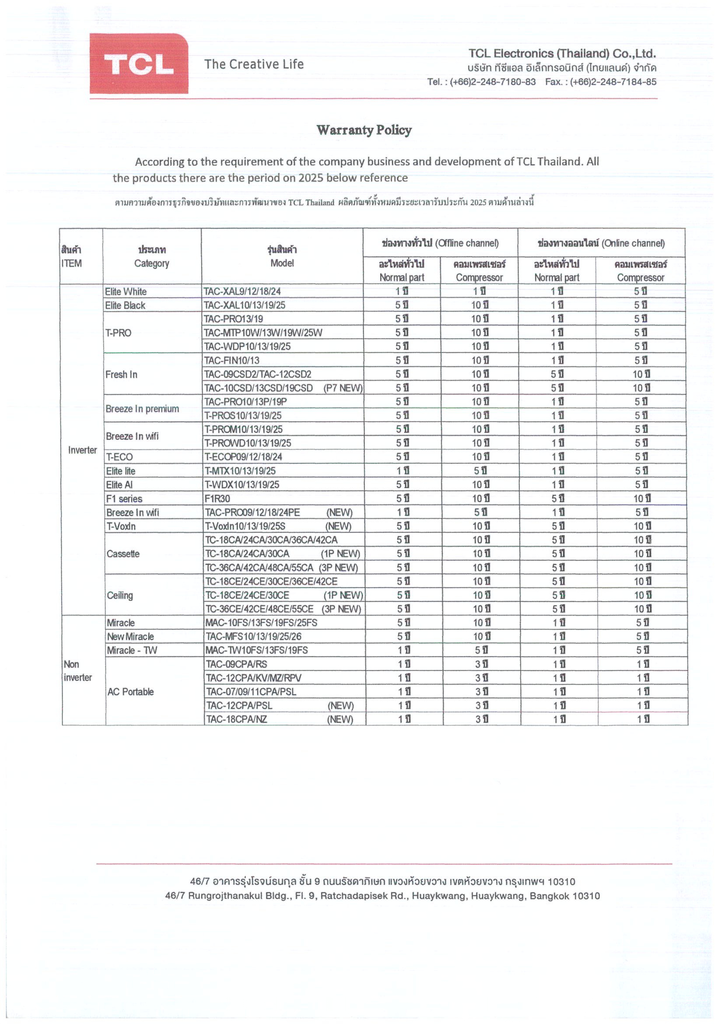 เพื่อเสริมสร้างความมั่นใจให้กับทั้งพันธมิตรทางธุรกิจและผู้บริโภค TCL ให้ความสำคัญกับ การรับประกันสินค้าเครื่องปรับอากาศที่ครอบคลุมและเชื่อถือได้ โดยแบ่งออกเป็นกลุ่มสินค้าตามระดับการรับประกันดังนี้: