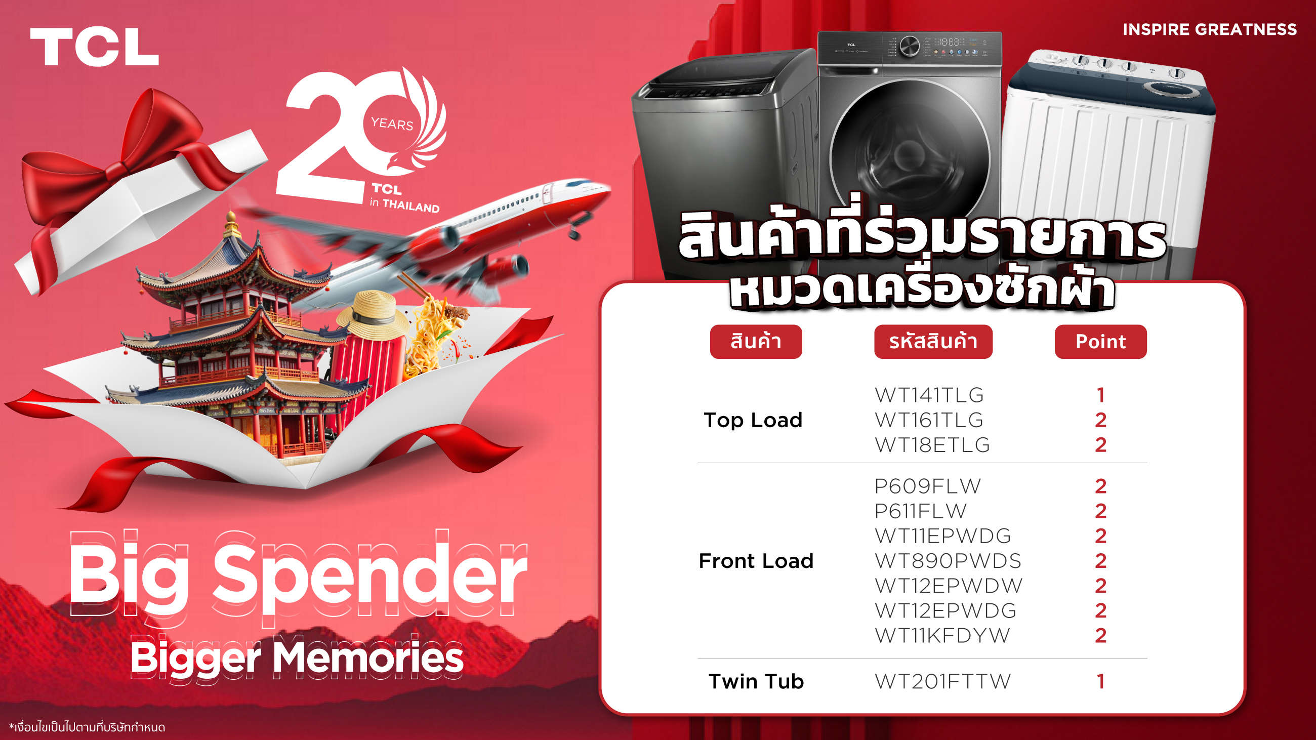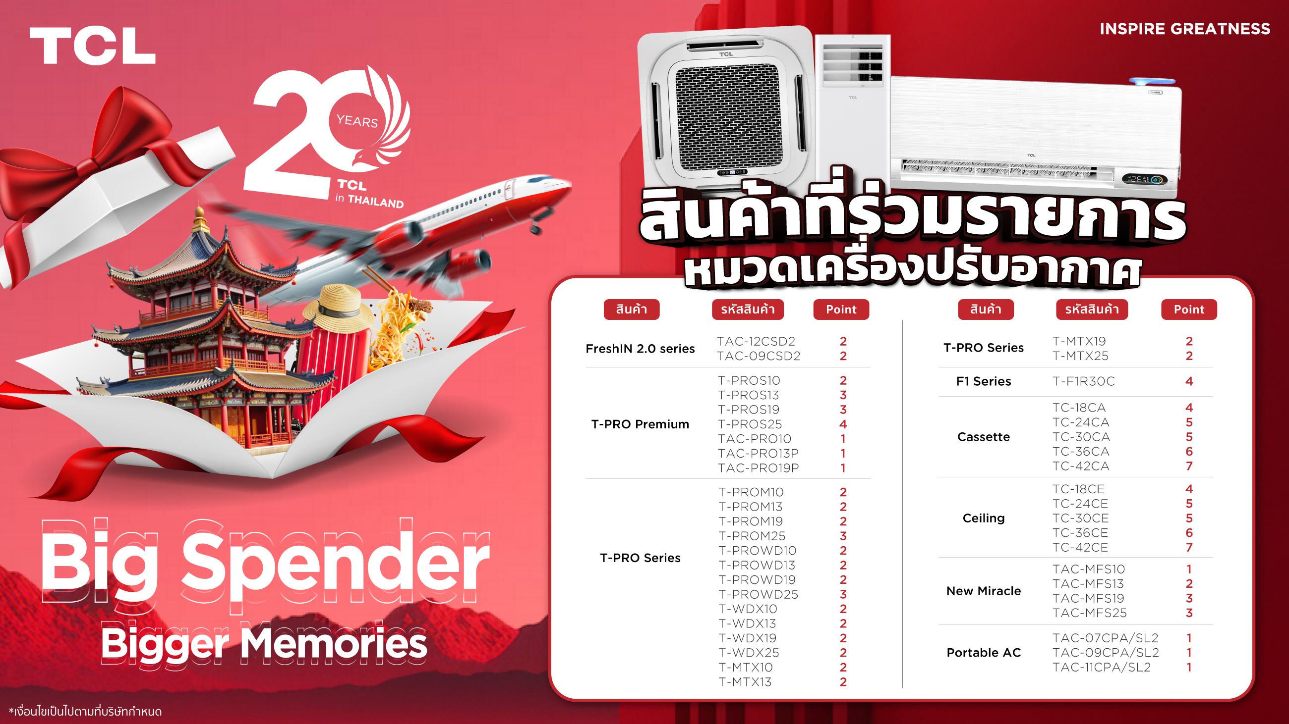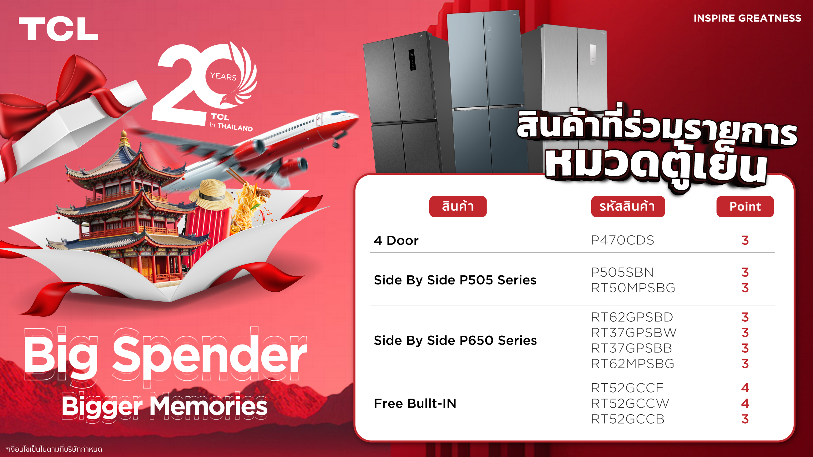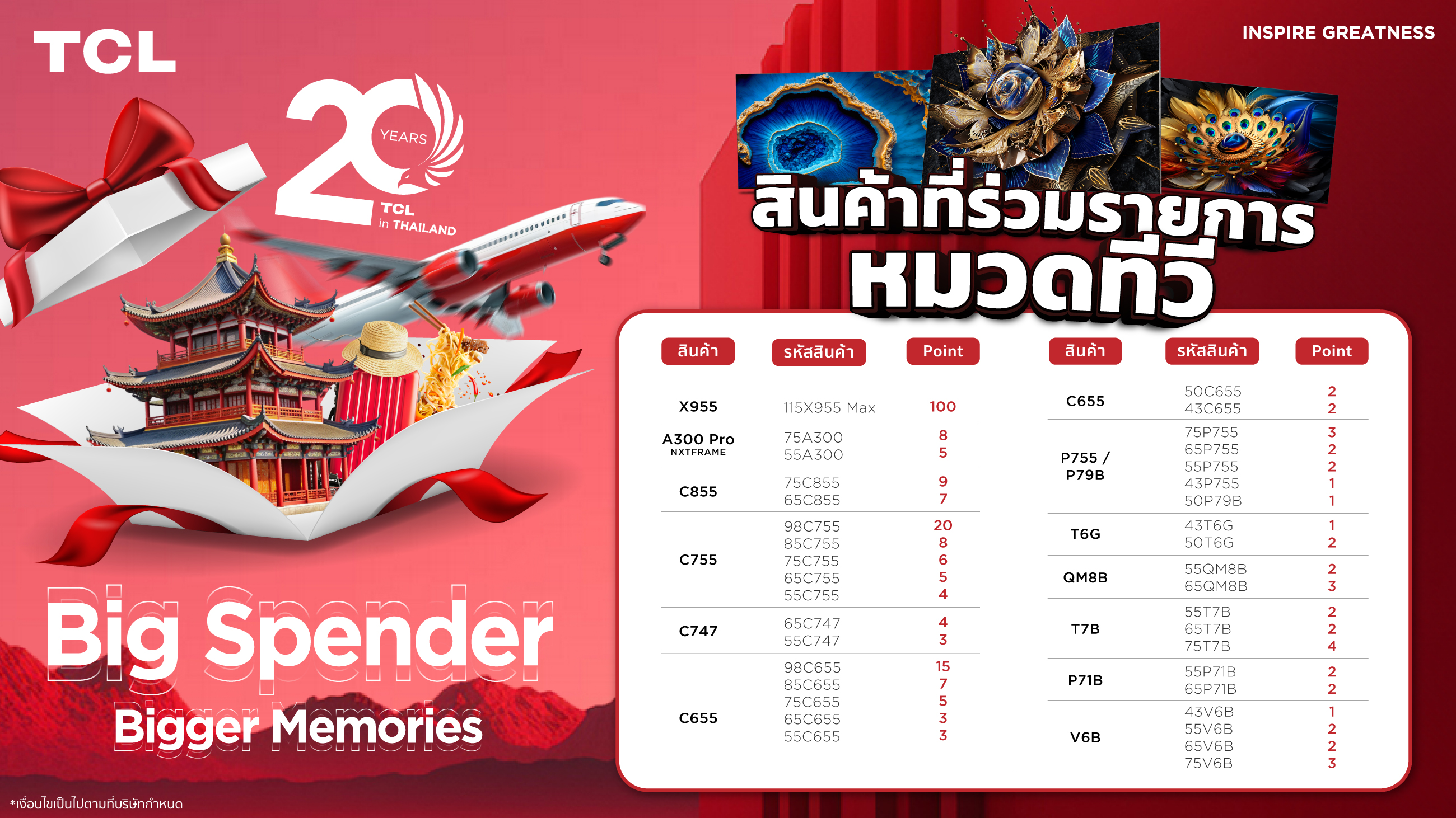 1. ทางบริษัทประกาศรางวัล Top Spender 20 รางวัล คัดเลือกจากผู้ที่มียอดสะสมแต้มสูงสุด 20 ท่านแรก ในวันที่ 15 กุมภาพันธ์ 2568 ผ่านช่องทาง Facebook page : TCL Electronics ภายในเวลา 18.00 น.