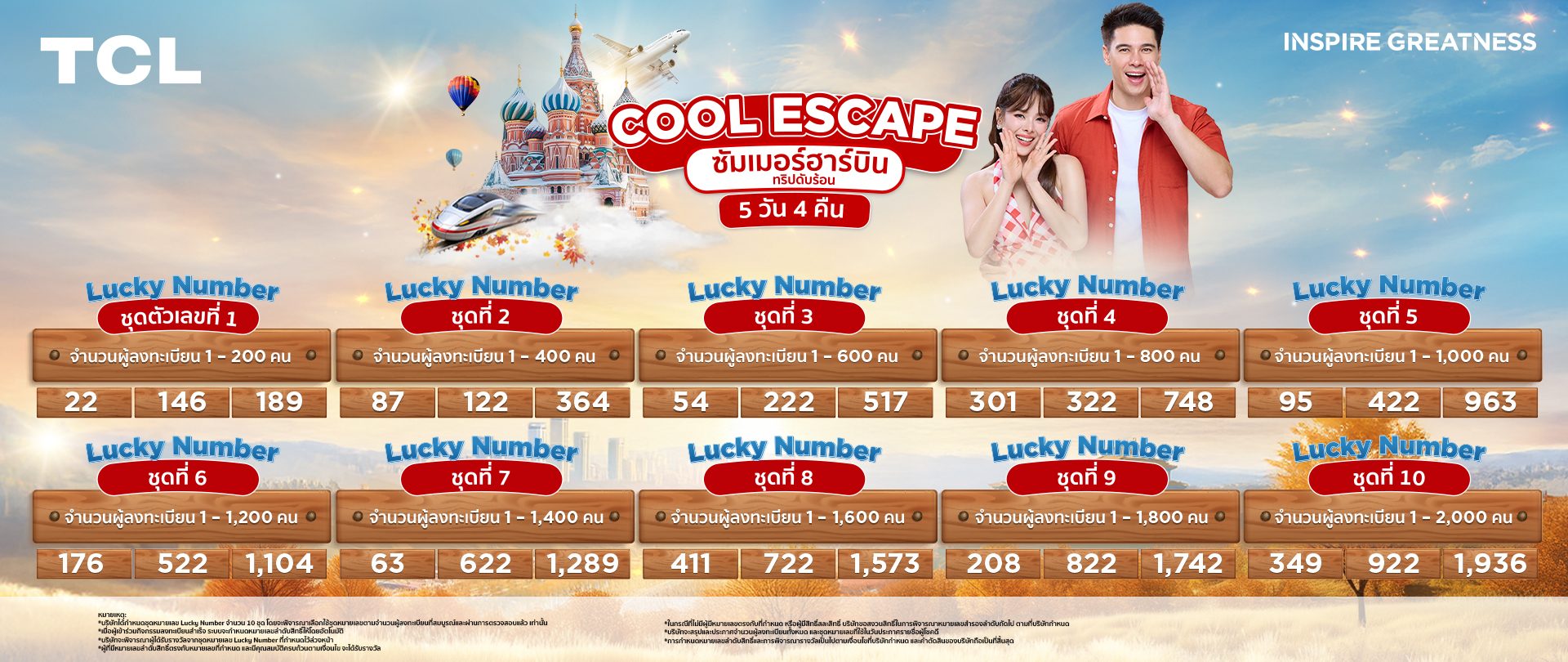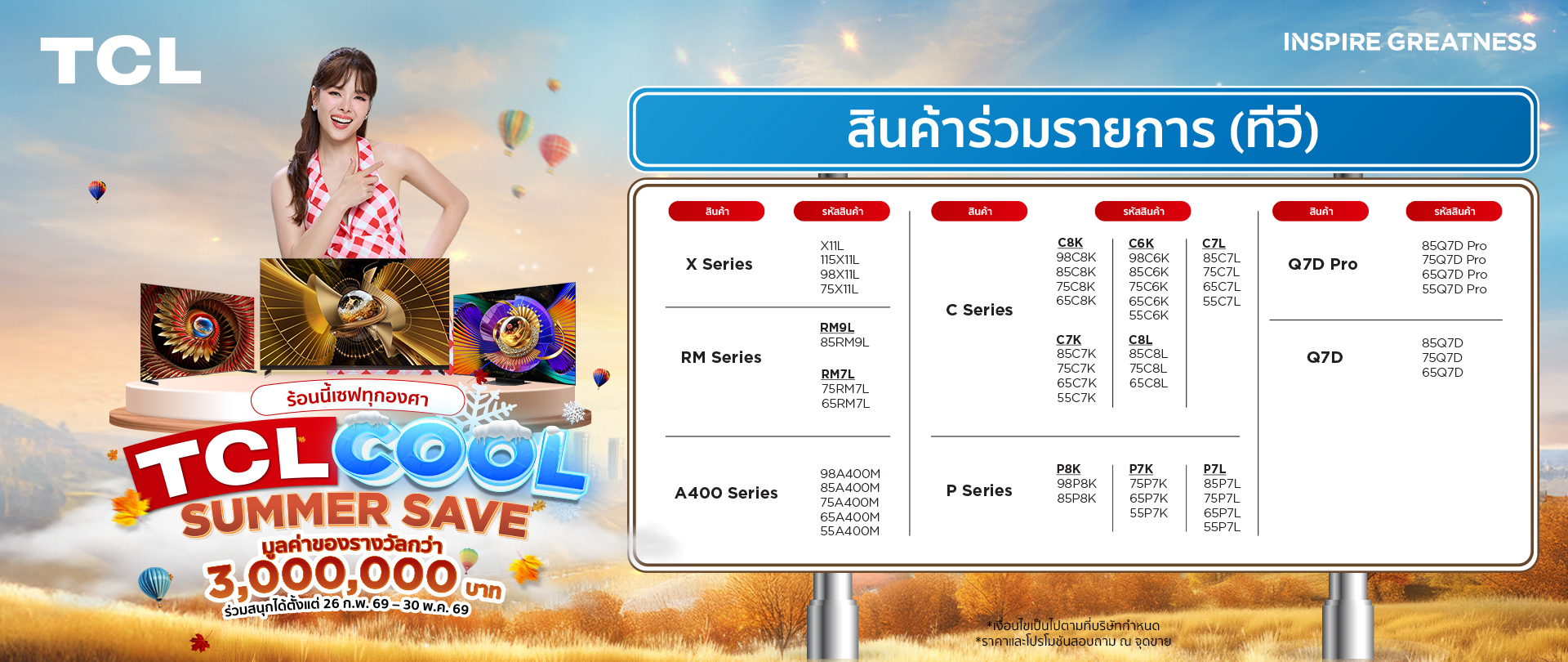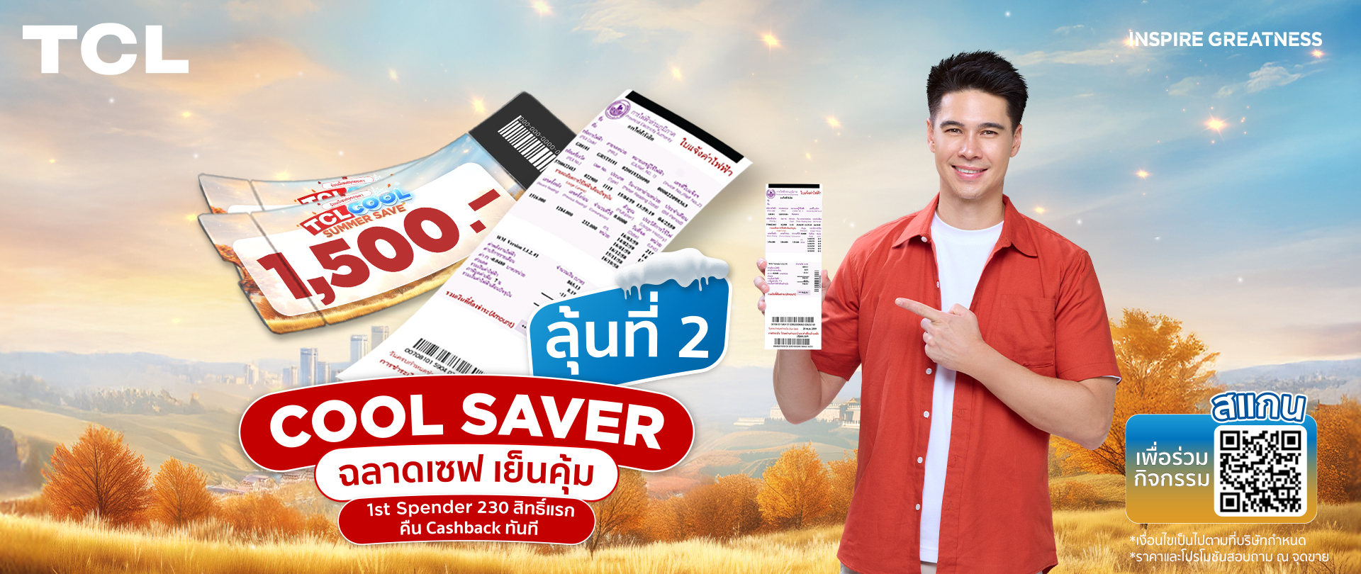 2. ผู้เข้าร่วมกิจกรรมต้องซื้อ สินค้าทีซีแอลที่ร่วมรายการ ผ่านร้านค้าสาขา ตัวแทนจำหน่ายที่ร่วมรายการทั่วประเทศ หรือช่องทางออนไลน์ของทางบริษัท ตั้งแต่วันที่ 26 กุมภาพันธ์ 2569 ถึง 30 พฤษภาคม 2569 เท่านั้น