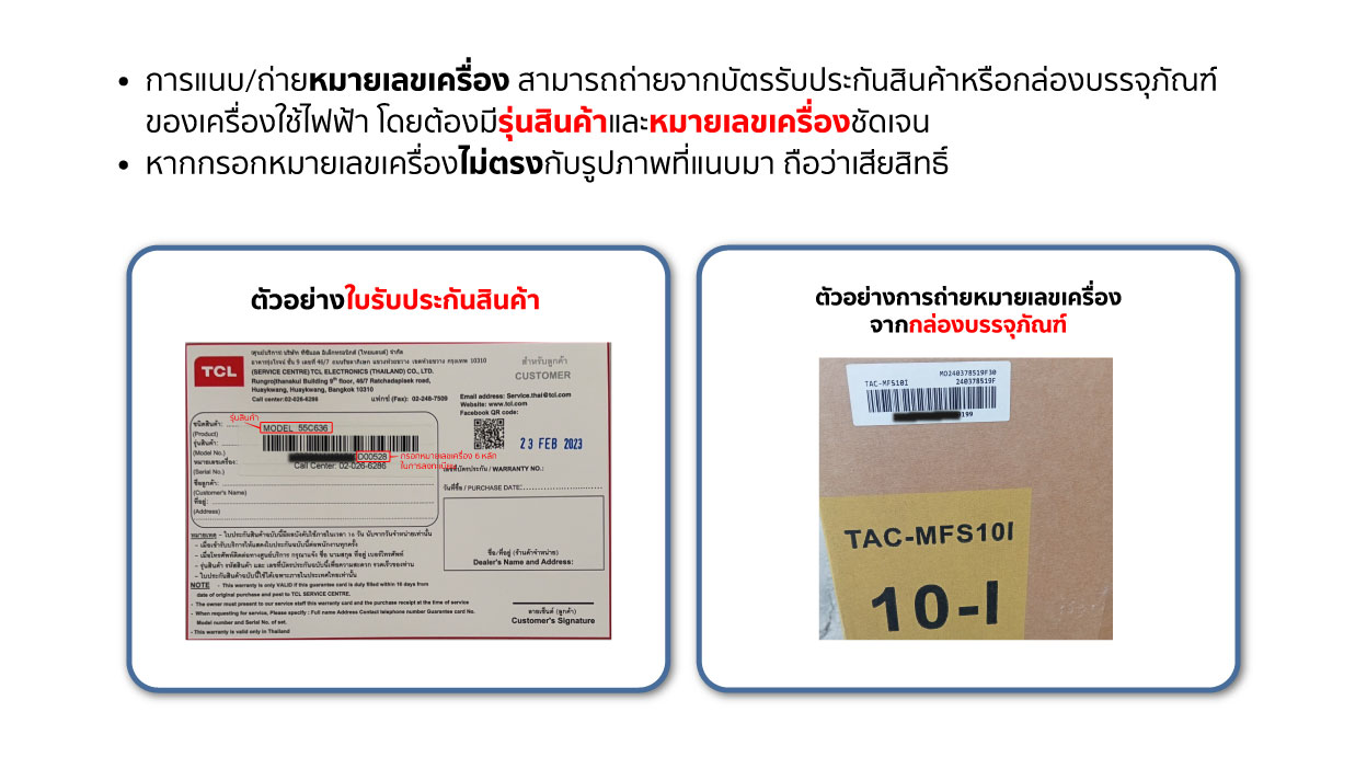 ข้อแนะนำในการลงทะเบียนใบเสร็จและบัตรรับประกันที่มีหมายเลขเครื่อง