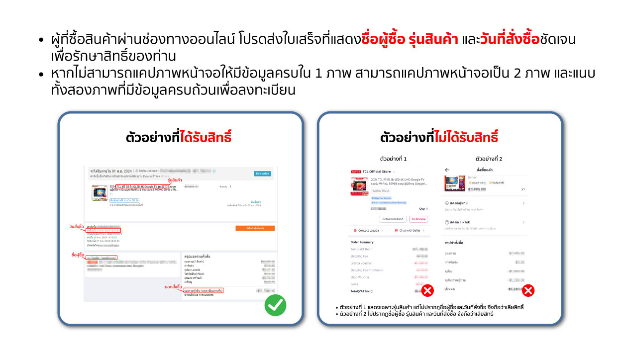 - วันและเวลาซื้อสินค้า รวมถึงวันและเวลาการลงทะเบียน ต้องอยู่ภายในระยะเวลาของรอบนั้น ๆ จึงจะถือว่าได้รับสิทธิ์