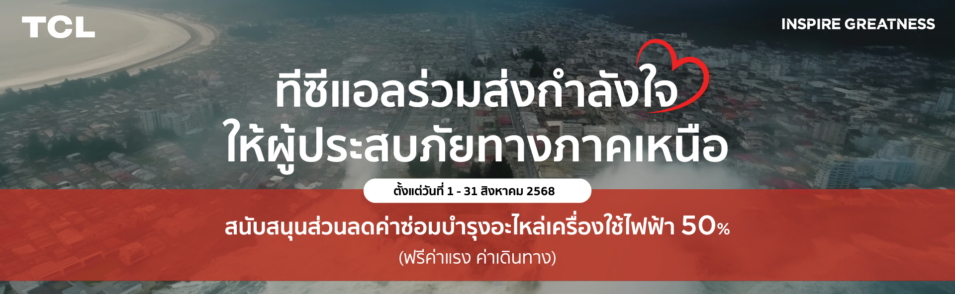 เพื่อร่วมบรรเทาความเดือดร้อนและแบ่งเบาภาระค่าใช้จ่ายในการซ่อมแซมเครื่องใช้ไฟฟ้าที่ได้รับความเสียหายจากอุทกภัย TCL จึงขอสนับสนุนบริการซ่อมบำรุงสำหรับลูกค้าที่อยู่ในพื้นที่ประสบภัยภาคเหนือ ด้วยสิทธิพิเศษดังนี้: