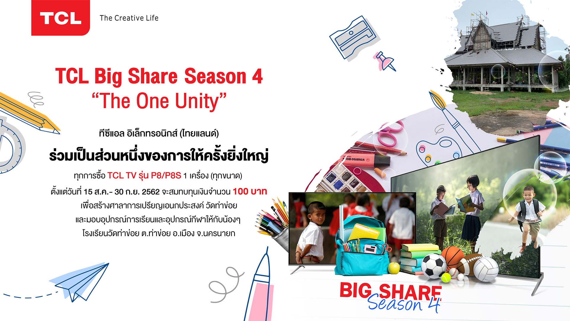 ประเทศไทย, August 15, 2019 – TCL Big Share Season. 4 "The One Unity" ขอเชิญทุกท่านร่วมเป็นส่วนหนึ่งของการให้ครั้งยิ่งใหญ่