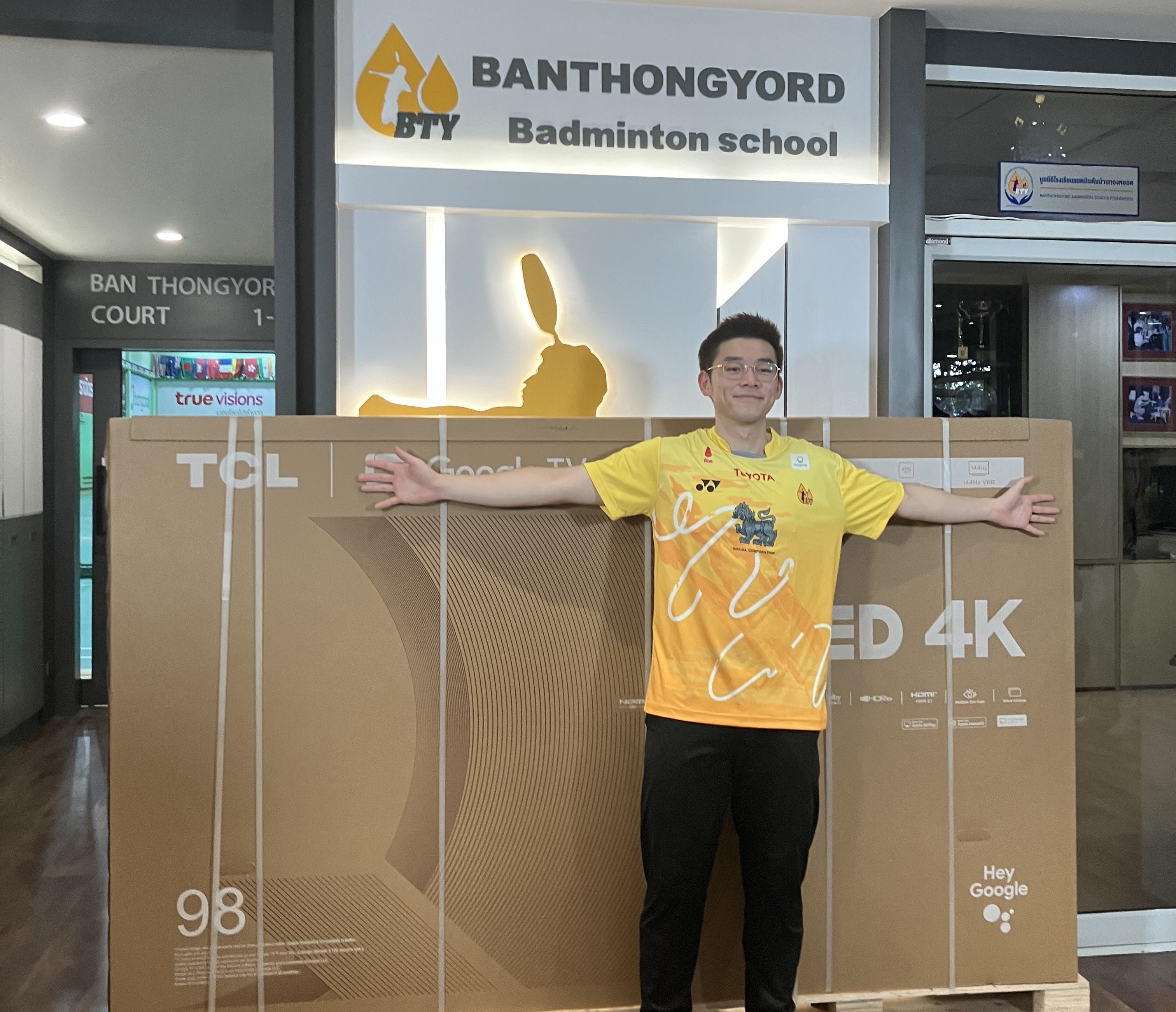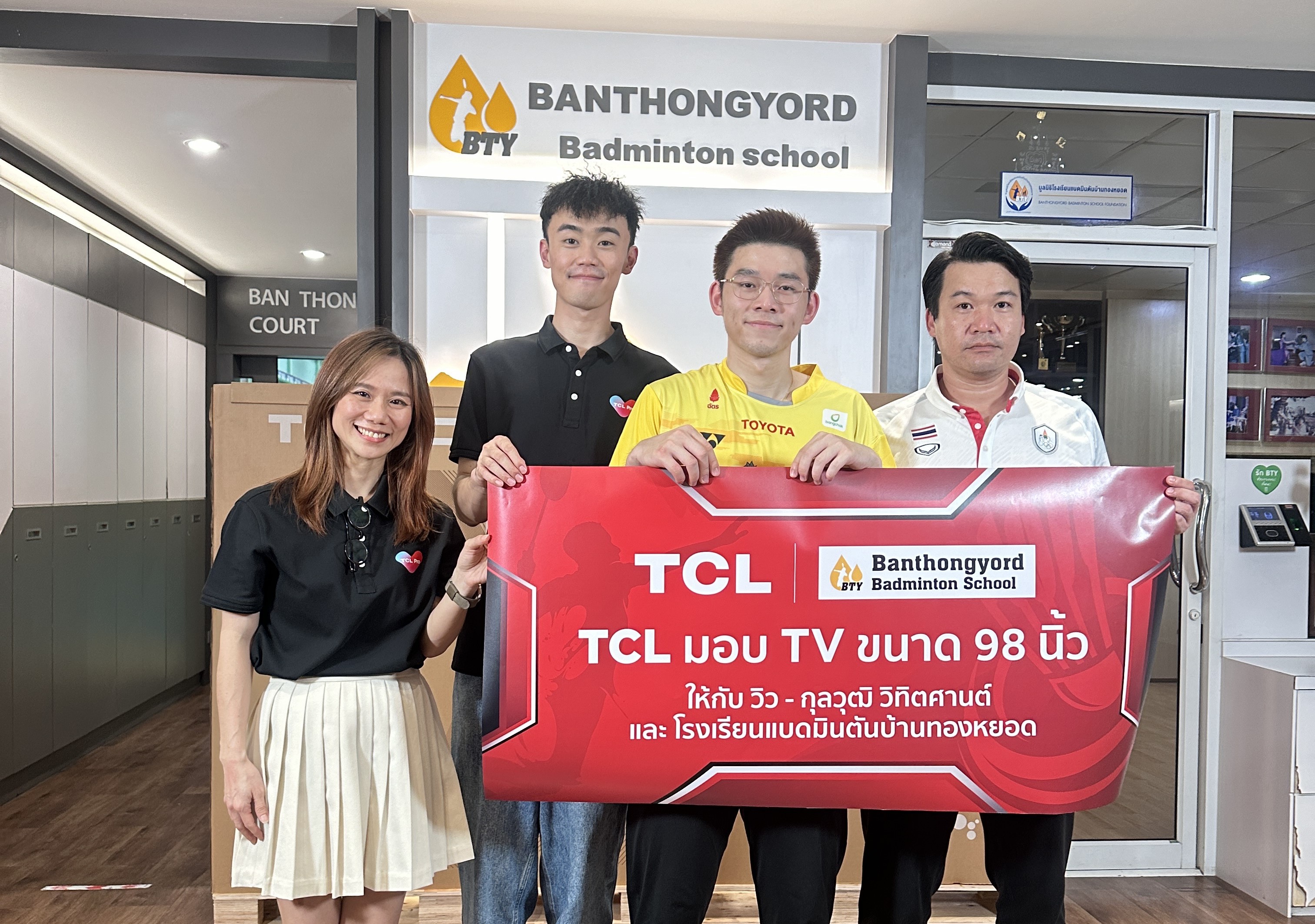 คุณดอน ถาง Marketing Director และ คุณสุกัญญา โชติอภิสิทธิ์กุล Branding Manager บริษัท ทีซีแอล อิเล็กทรอนิกส์ (ไทยแลนด์) จำกัด มอบ TV ขนาด 98 นิ้ว ให้กับ โรงเรียนแบดมินตันบ้านทองหยอด และ กุลวุฒิ วิทิตศานต์ (วิว) ผู้สร้างประวัติศาสตร์หน้าใหม่ ให้กับวงการแบดมินตันไทยด้วยการคว้าเหรียญเงินชายเดี่ยว ในการแข่งขันโอลิมปิกปารีส 2024 โดยมีโค้ชผู้ฝึกสอน นายภัททพล เงินศรีสุข (โค้ชเป้) และ กุลวุฒิ วิทิตศานต์ (วิว) เป็นผู้รับมอบ ณ โรงเรียนแบดมินตันบ้านทองหยอด จังหวัดกรุงเทพมหานคร